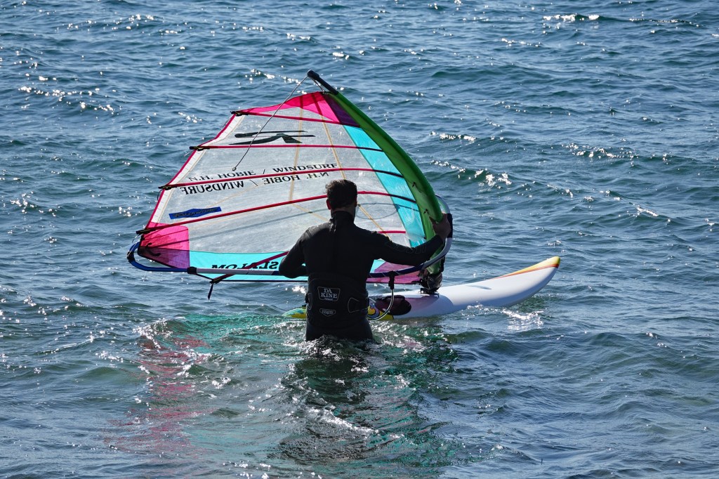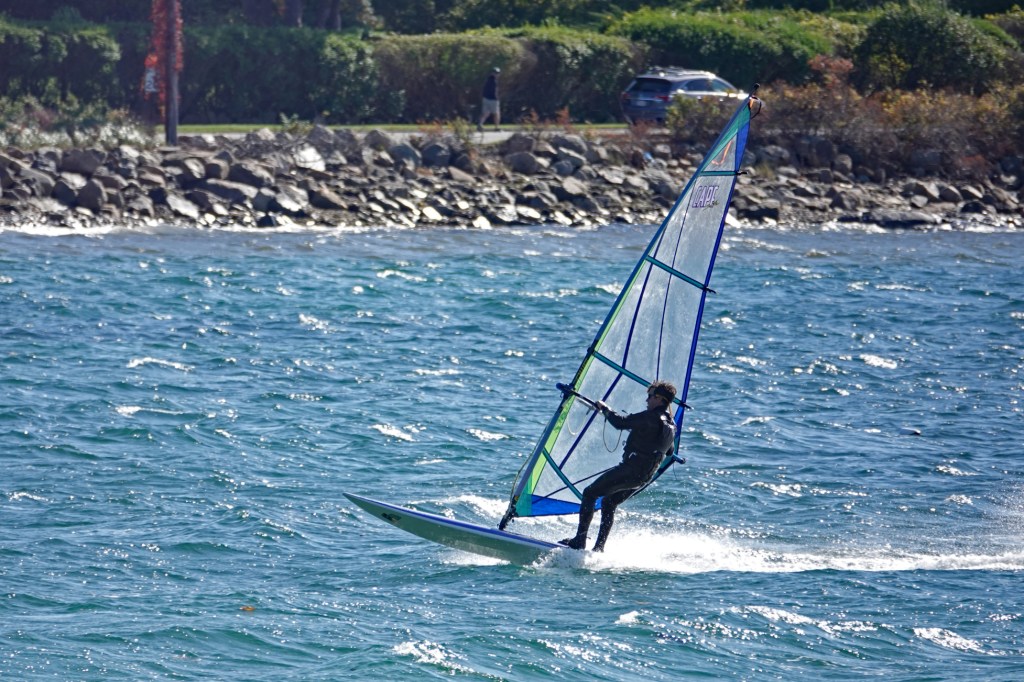 Two windsurfers enjoying the wind and relatively calm harbor, launching off Niles Beach on Saturday afternoon.