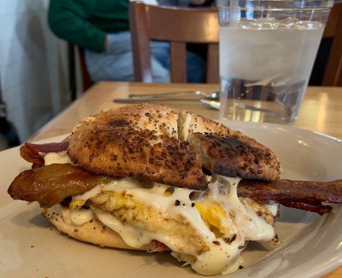 After the podcast last week, we took my sister Paula to Mom’s Kitchen for breakfast. It was so filling, she was still stuffed when she got back to New York ! YUMMMMMM…..weekly specials and hours here. We got a breakfast sandwich on a bagel, a veggie omelet and scrambled eggs. Always friendly, always great food.