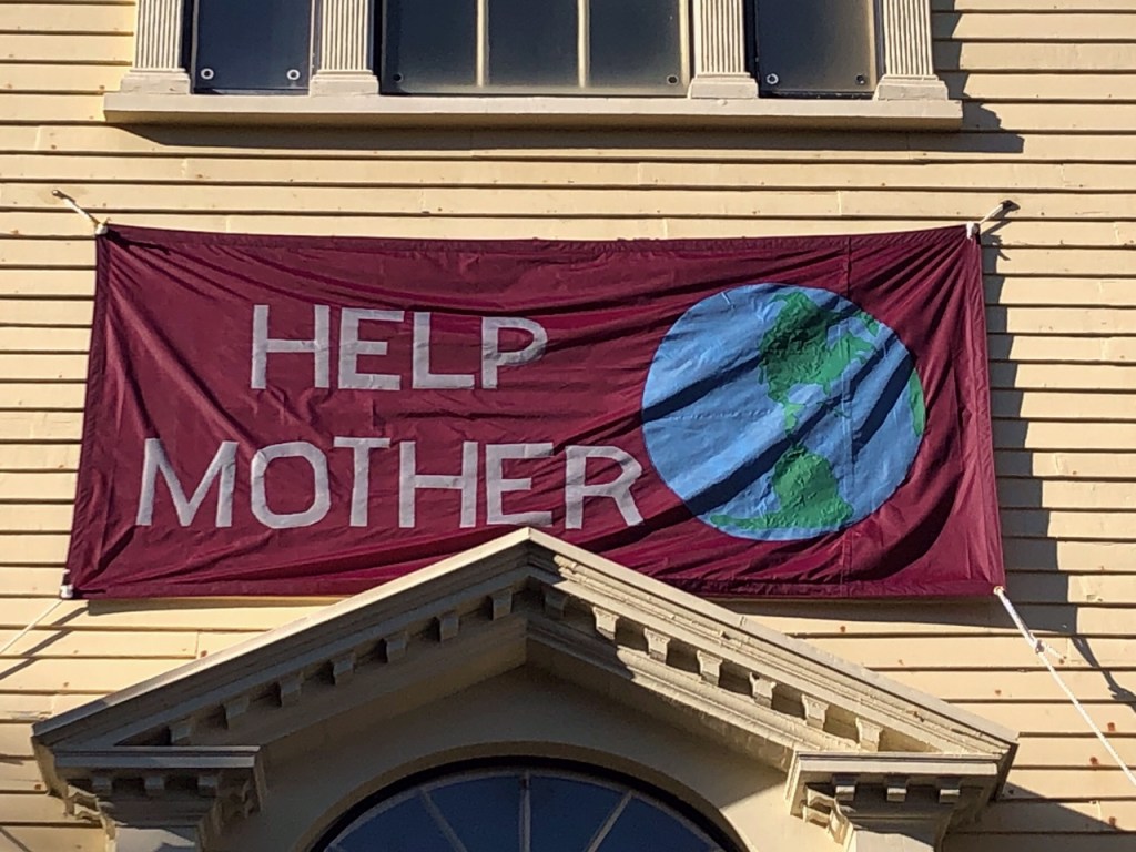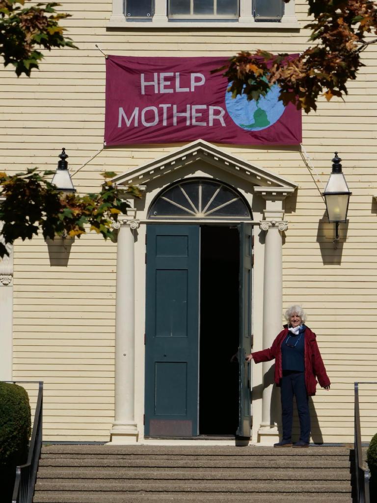 As the leaves fell and the votes were counted a new banner rose on the Unitarian Universalist Meetinghouse on Middle Street. It proclaims “Help Mother” with an image of Mother Earth. Congregation member Sally Waite, who has been making banners in Gloucester since Covid 19 and in Portland for years before that, loves Gloucester’s Babson Boulders. Sewed into her new banner, Roger Babson’s nearly 100 year old message about family responsibility takes on a new meaning, reminding us to respect the interdependent web of existence we all depend on.