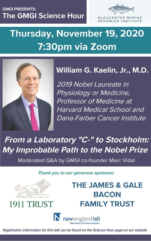 Please join us on Thursday, November 19th at 7:30pm on Zoom to hear Dr. Kaelin’s journey from being a “C-” student to earning one of the most prestigious awards in medicine.