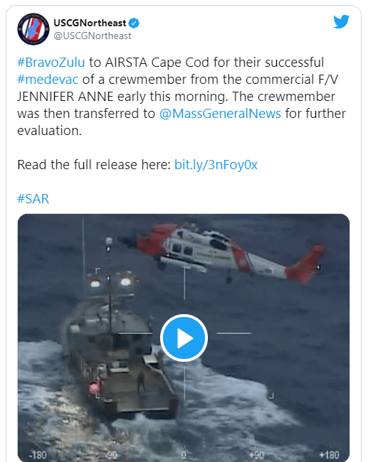 #BravoZulu to AIRSTA Cape Cod for their successful #medevac of a crewmember from the commercial F/V JENNIFER ANNE early this morning. The crewmember was then transferred to @MassGeneralNews for further evaluation.