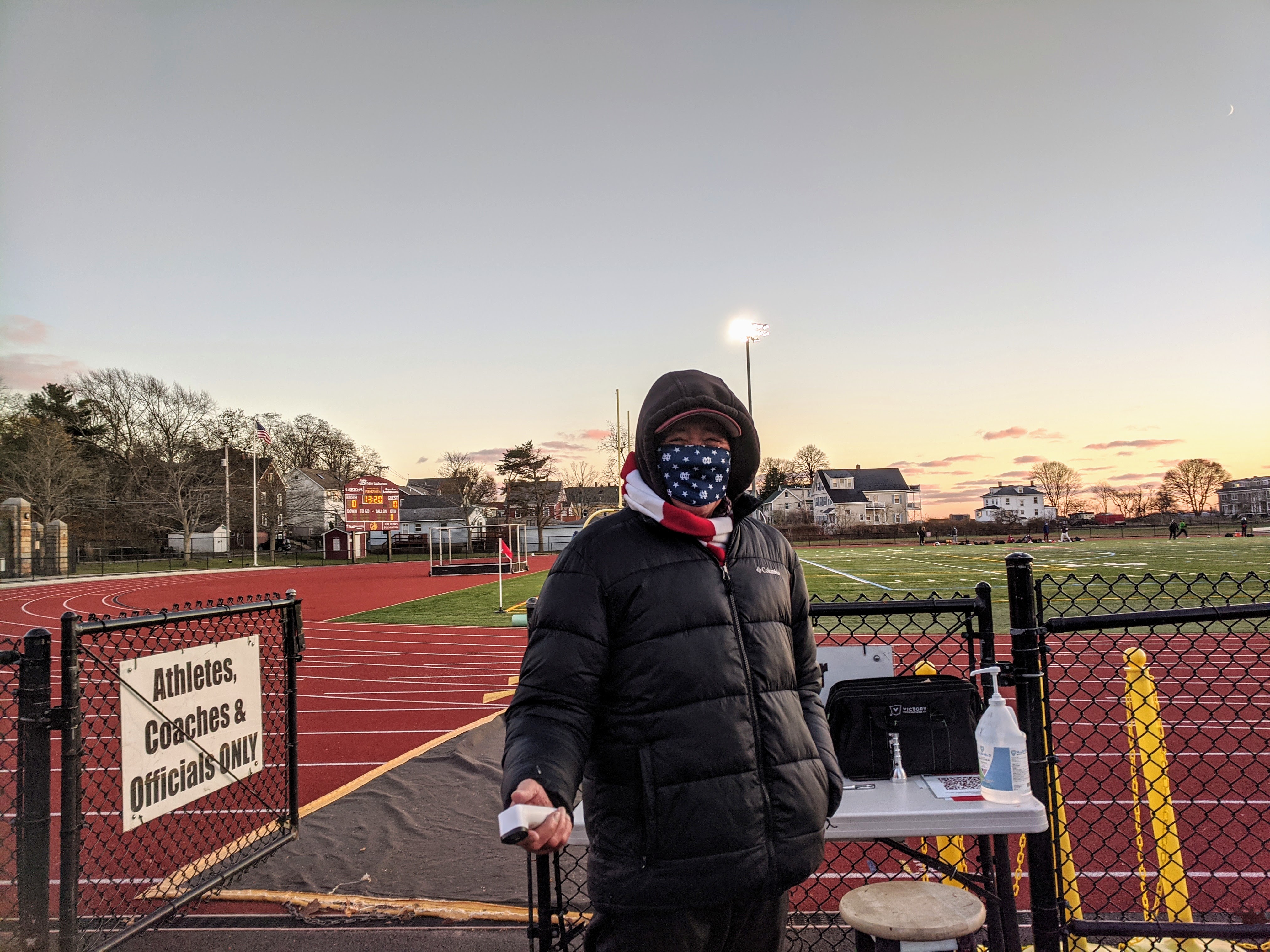 The kindest gatekeeper ever, Flip is taking taking and recording temperatures, one of the new Covid-19 safety protocols. GHS Boys Varsity Soccer (a win vs. Swampscott) New Balance Newell Stadium Gloucester, Mass 11/18/2020