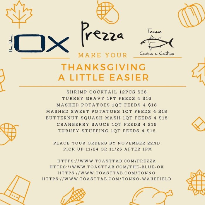 Make Thanksgiving A Little Easier. Place your orders by this Sunday, November 22nd and pick up your order on the 24th or 25th after 1pm at Tonno, Prezza or the Blue Ox