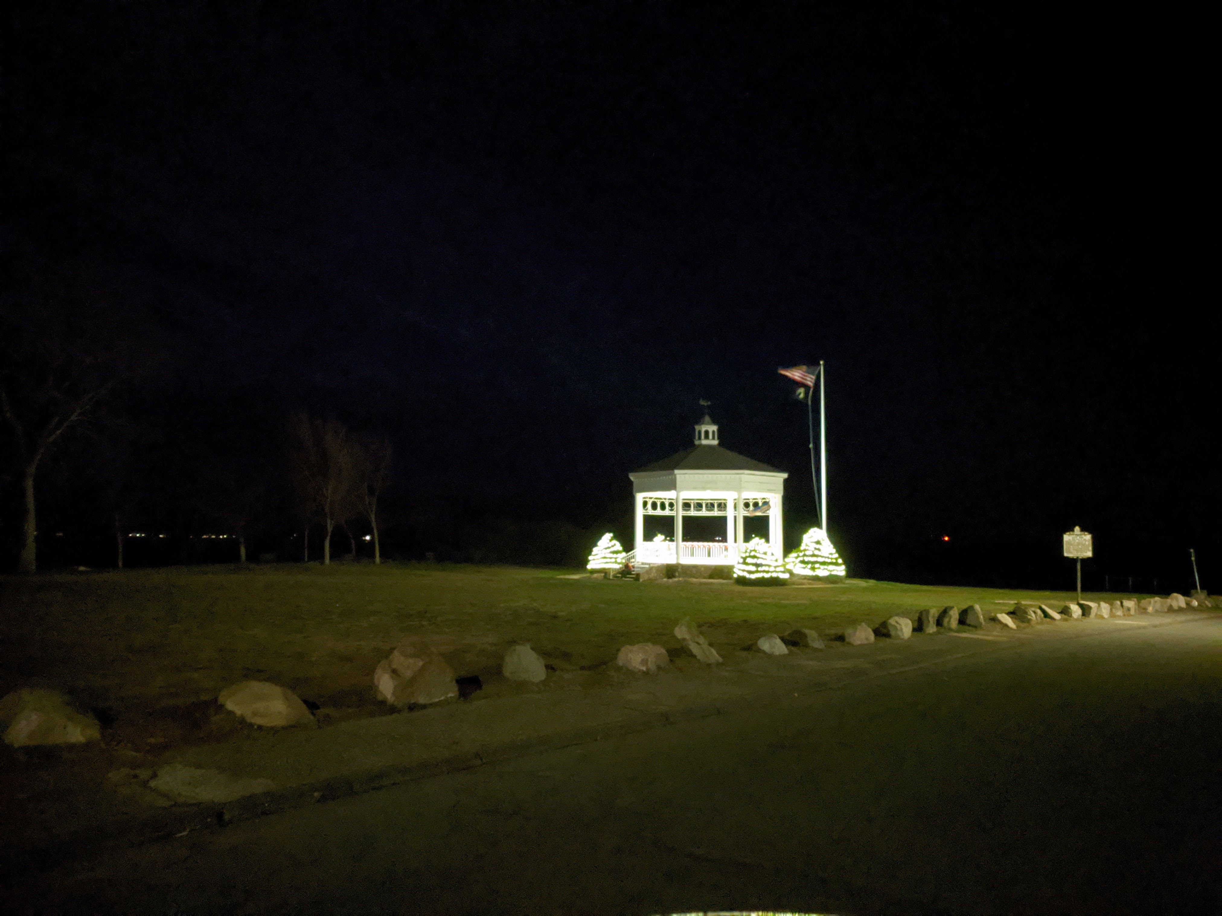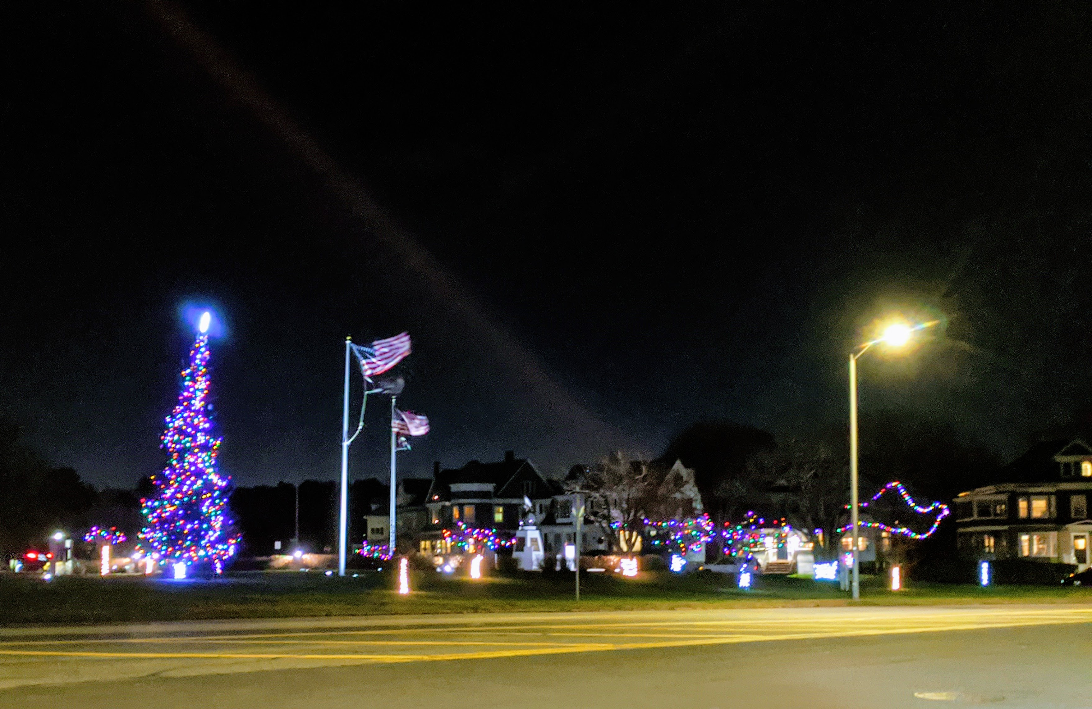 Scenes of Annisquam: Annisquam Village Hall; Annisquam Bridge; white lights and wreaths and trees at junctions. Followed with en route detours off Washington Street via Cherry, Spruce, Gee, Finch Lane, Reynard, Holly Street | Goose Cove Lane (near Willow Rest), Dennison