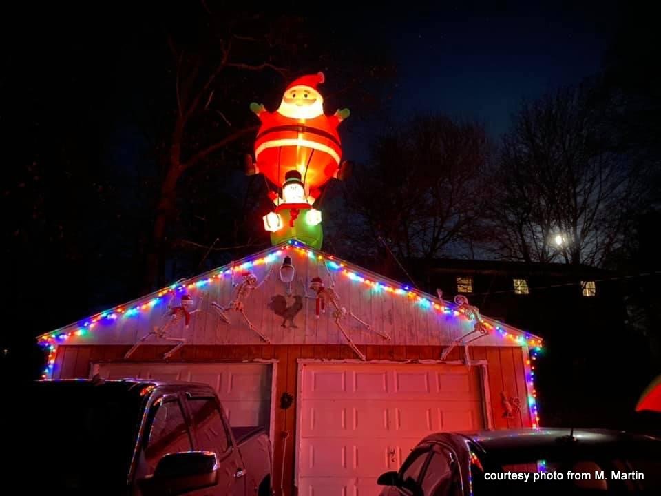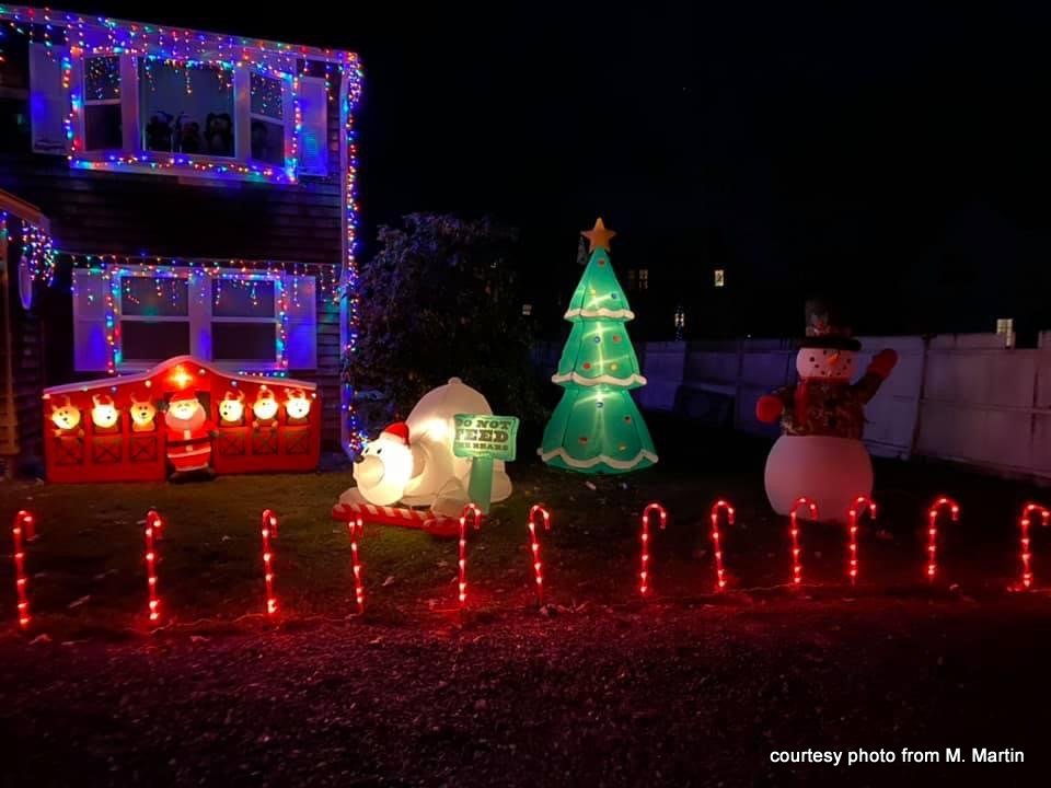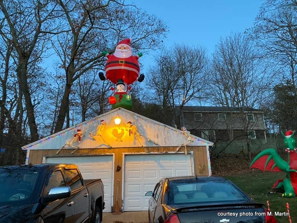 15R stanwood ave has an amazing display the home owner encourage passers by to drive down the driveway to see it all. this year they have a missive santa hot air balloon that stands 12Ft tall on the roof of the garage you can see it driving down the street
