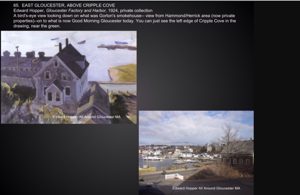 A classic Edward Hopper inspired by Gloucester will be sold at Sotheby’s auction this morning*. Architectural and natural elements in the drawing remain recognizable today. The scene overlooks the same house on East Main, Capt. Joe & Sons, and Cripple Cove (see then/now comparison photos below). The Gorton’s factory building there burned down. Cripple Cove playground is the green on the right of the Hopper image.