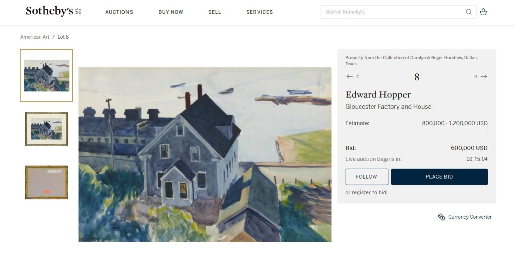The Sotheby’s December 11, 2020 auction offered a variety of American art from various collections. The sale results were a mixed bag of purchases, passes, and pulled works. Only one work sold far above estimate, thanks to a bidding war, a western scene by John F. Clymer. Scroll below the Hopper and Gloucester images to see the Homer.