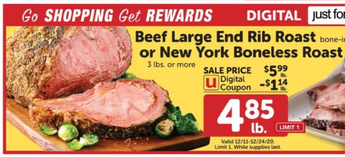 Poll: What’s The Better Value On These Two Rib Roast Sales- Market Basket Semi Boneless Angus Choice Rib Roast at $6.99lb or Shaws Large End Choice Rib Roast at $4.85lb