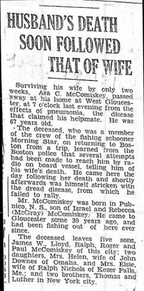 Many of you might not know that I’m 4th. Generation Gloucester born. This story is about my Paternal Great Grandfather published in the Gloucester Times 1931. My Great grandfather fished out of #Gloucesterma on the Morning Star and when came home from fishing he was informed of his wife’s passing. He passed away a few weeks later. Fishing was part of my heritage. My fathers ancestors arrived here in the 1860’s from Nova Scotia and My Moms ancestors even earlier arrived here from Ireland. God Bless the men and women who still work to bring fish to Gloucester. I am #gloucesterproud