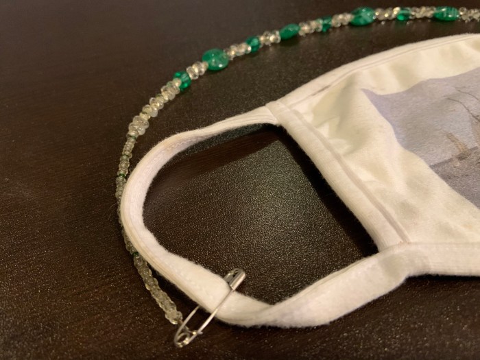 A mask-hack you might find helpful: When the eyeglass chain I had been using to keep my mask around my neck broke, I was a little frantic for a quick fix. I attached safety pins to each end of a necklace and VOILA! Problem solved. A necklace and safety pins make a pretty and functional way to keep my mask nearby. You’re welcome. Please share your own mask hack in the comments!