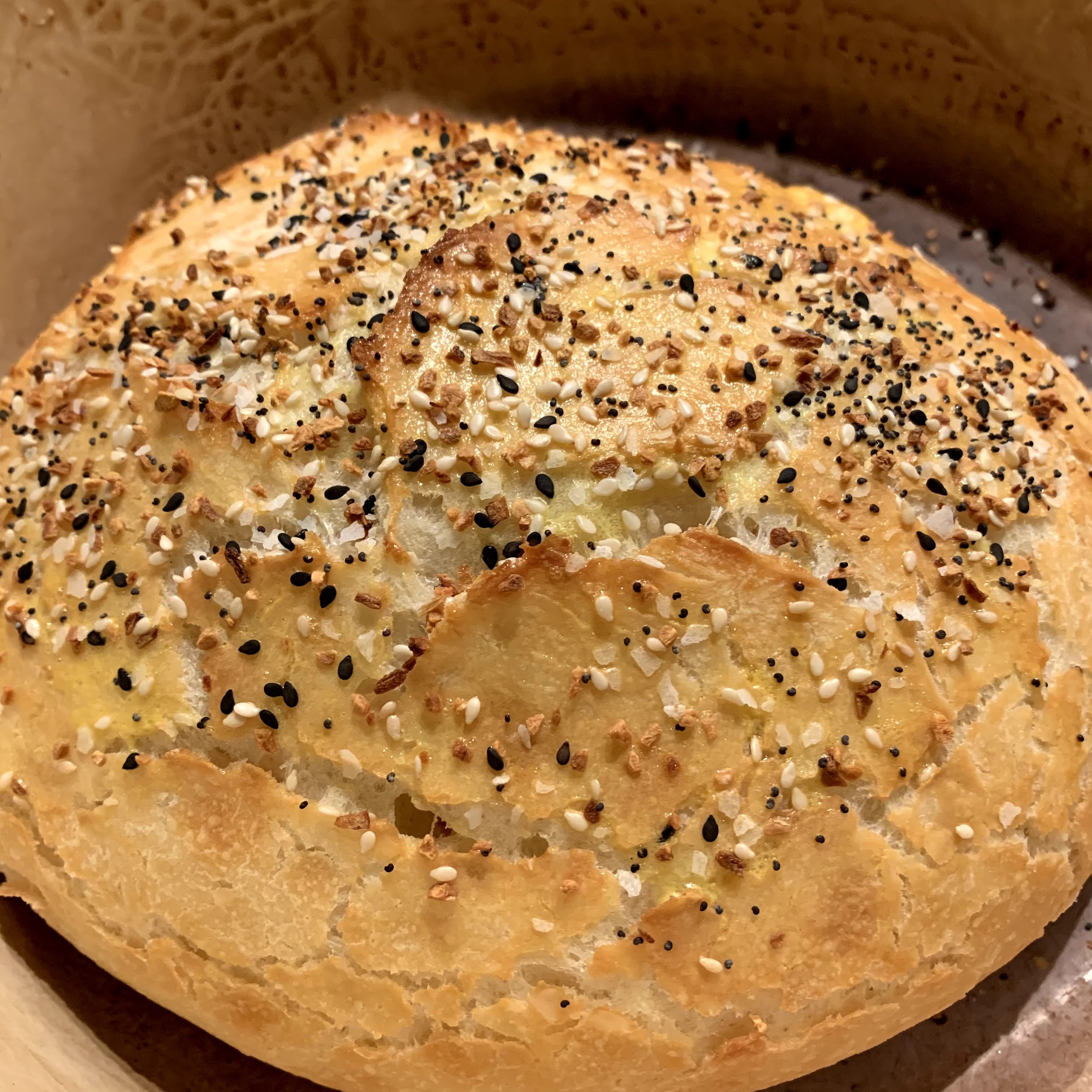 Last night Kate suggested an egg wash right after taking off the lid of the dutch oven. So after the 30 minutes of baking with the lid on, I took the lid off, brushed with egg wash and sprinkled on some Everything But The Bagel Seasoning (get some here)- https://amzn.to/38M3DTJ