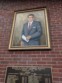 Ralph B. O’Maley Mayor portrait and detail from school dedication plaque_both at O’Maley Gloucester, Ma © Catherine Ryan March 2017