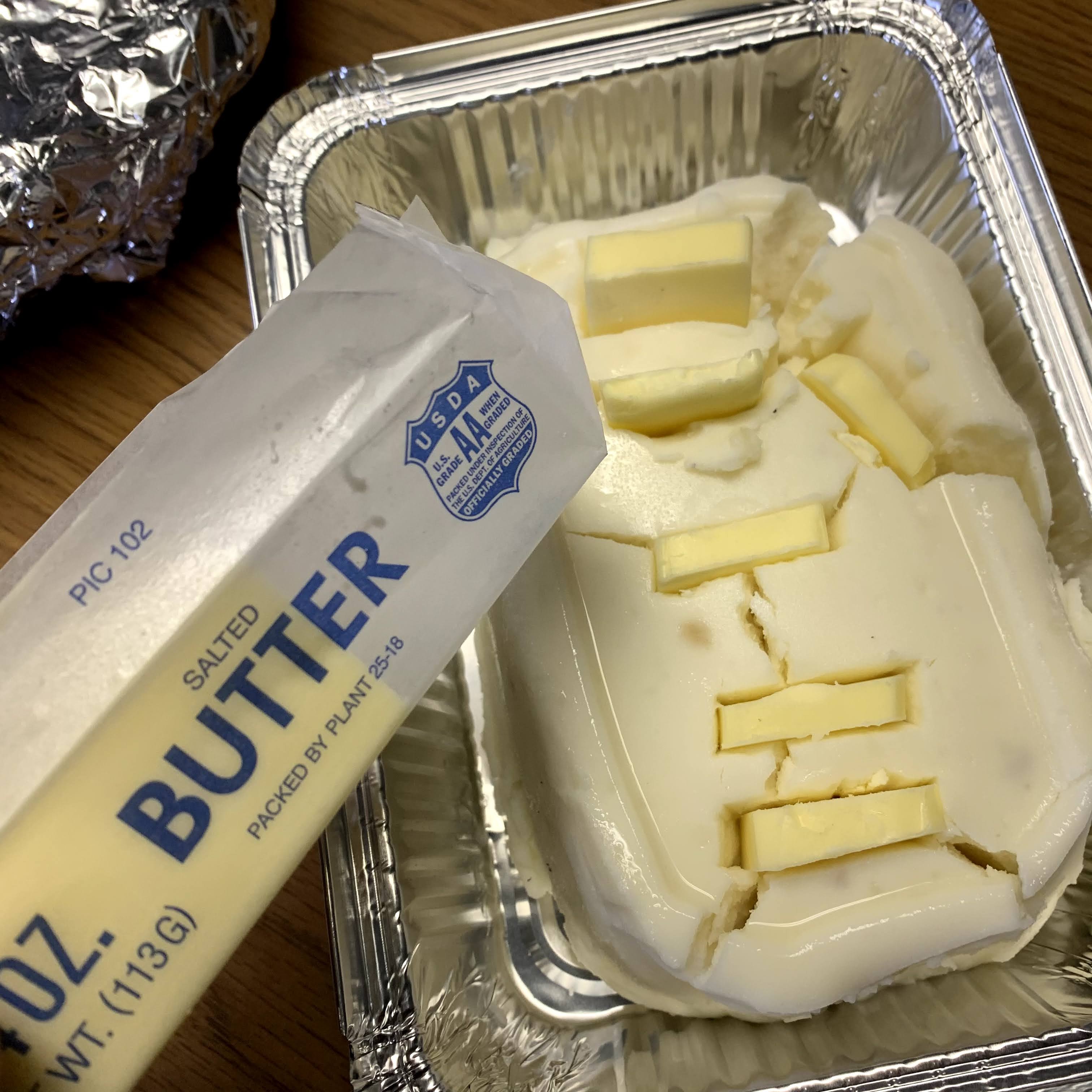 Transfer the container of mashed potatoes to a tin container, cut up a half a stick of butter and insert the pads of butter evenly.