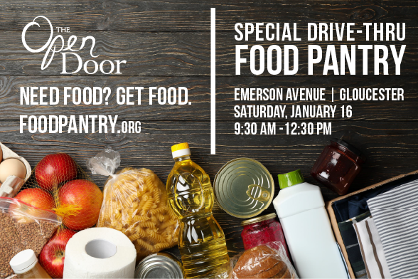 Let food be one less thing to worry about. The Open Door is hosting a Special Drive-Thru Food Pantry on Saturday, January 16, at Pathways on Emerson Avenue in Gloucester from 9:30 AM to 12:30 PM.