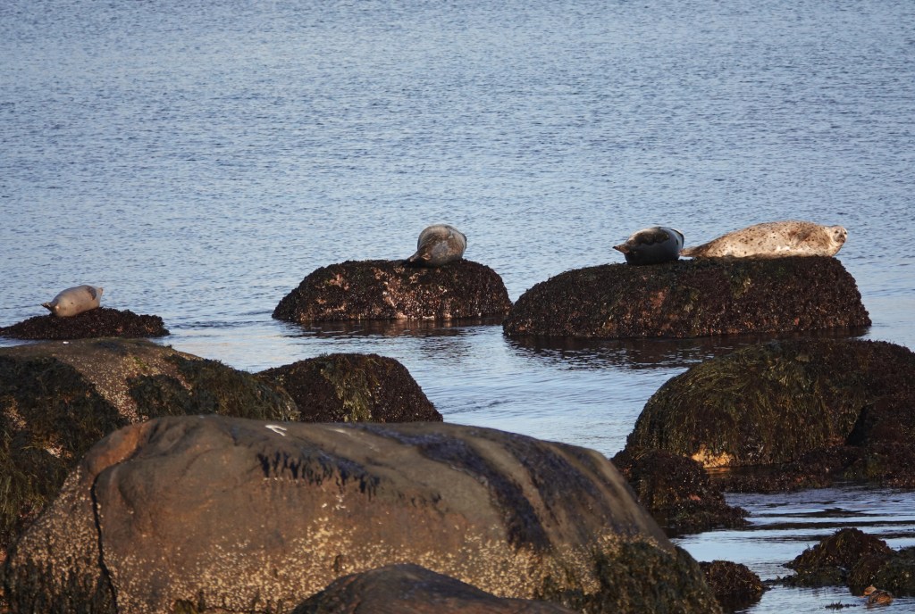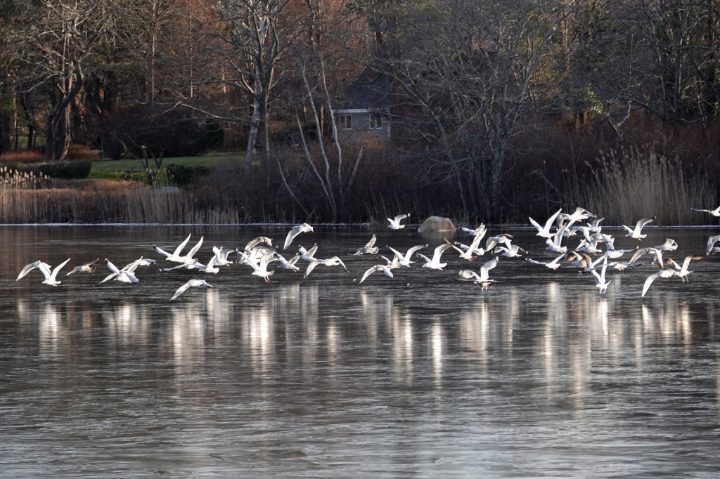 On Tuesday we had a record (for us) 17 seals hauled out on the low tide rocks at Brace Cove, before sunset; half of them in these photos. On the way over there was a large formation of gulls taking off from the ice on Niles Pond and guiding us to the cove.