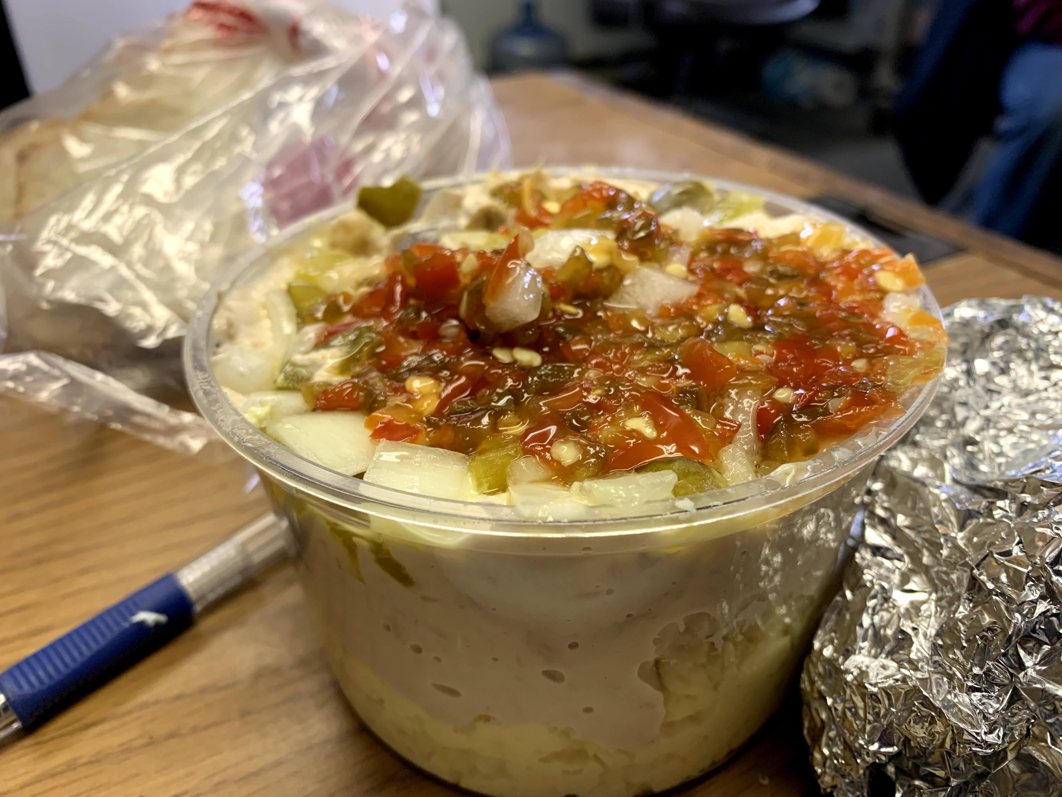 McCarthy went egg and tuna salad mixed and bunless with onions, hots and pickles on top.