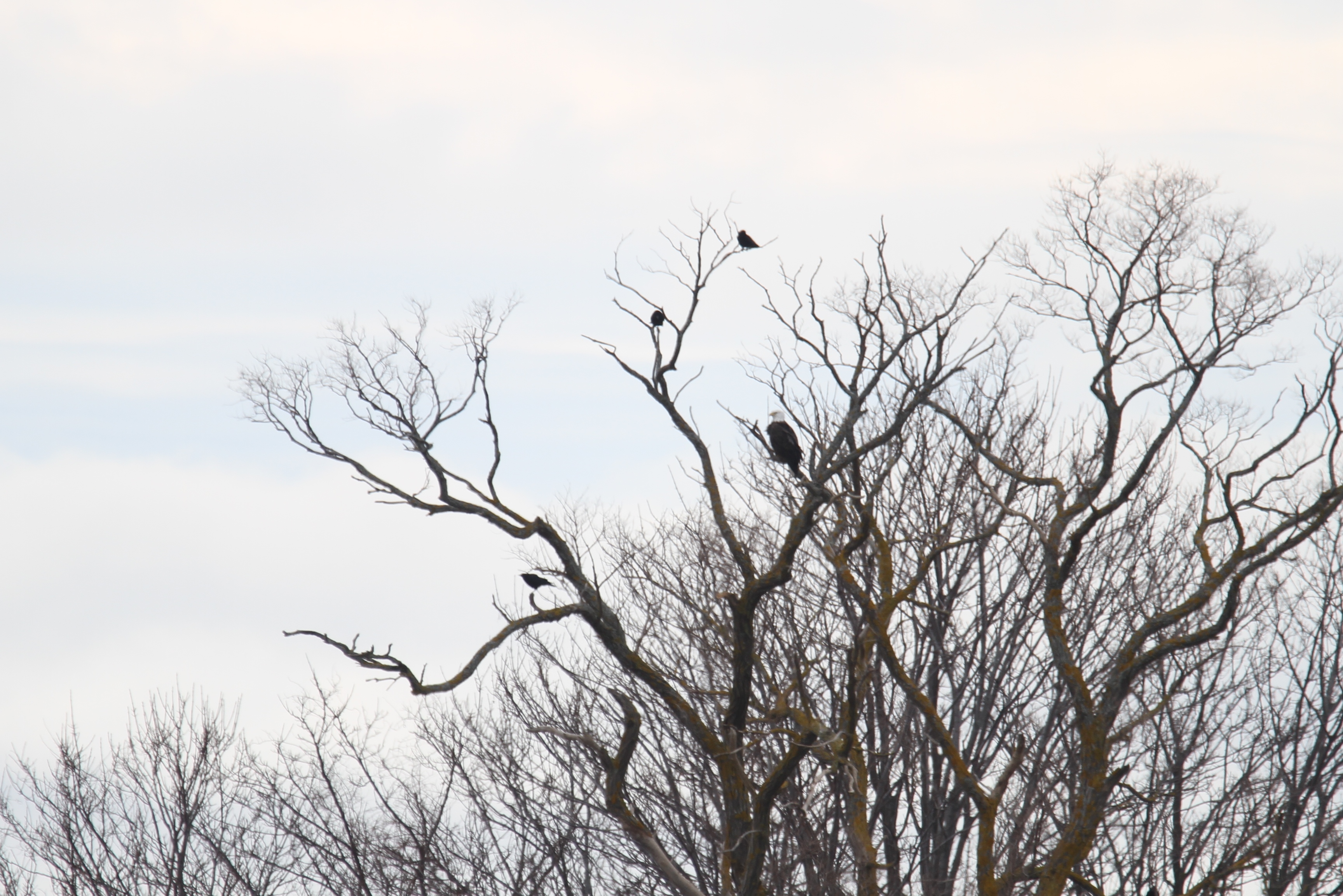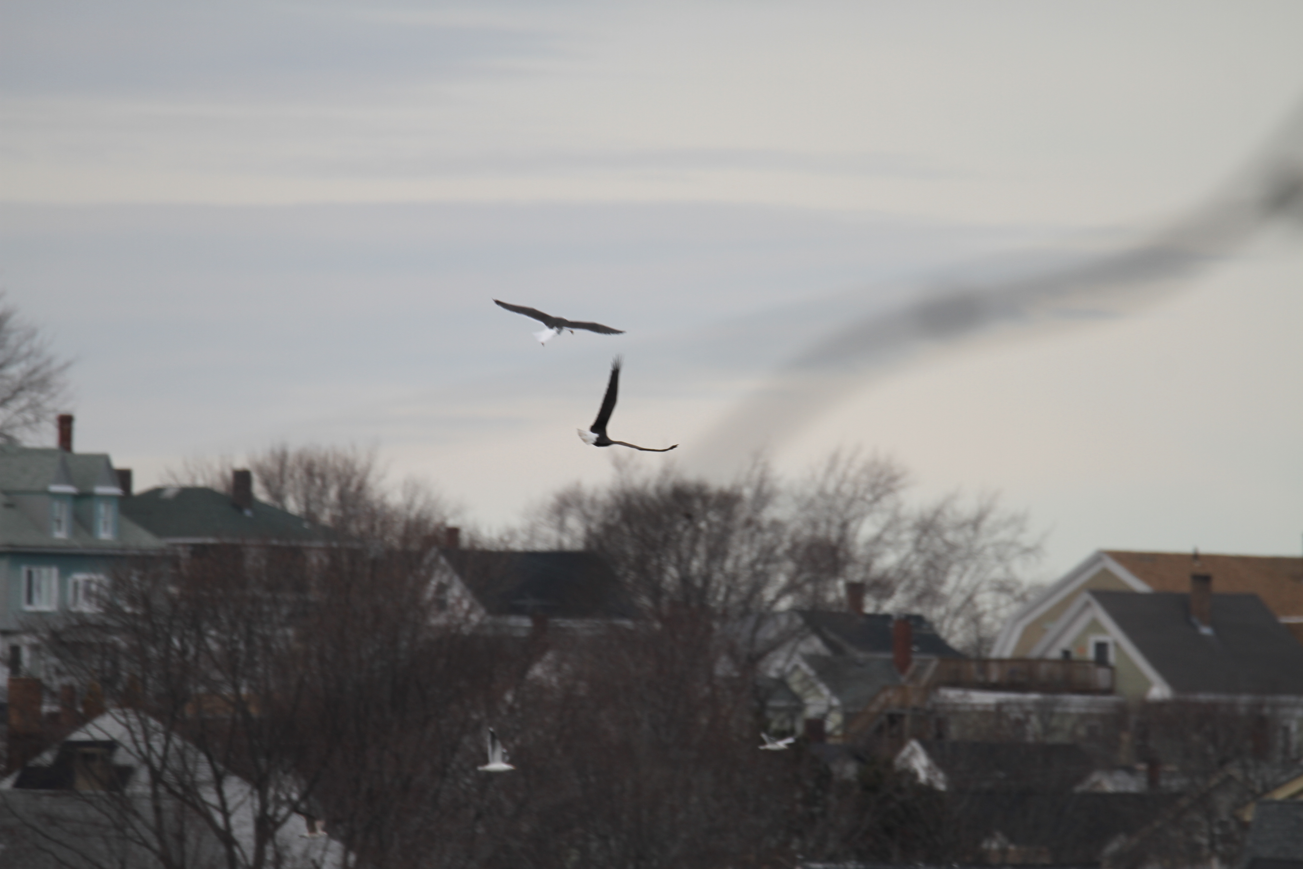 Yesterday was a little dreary but brightened up considerably for me when I spotted an eagle on Rocky Neck! Sitting high in a tree, the crows were raising a ruckus which drew my attention. As I was repositioning for a better shot, the eagle took off over the harbor only to be harassed by seagulls in flight. As I waited and hoped for a repeat performance, a woman came out of the Paint Factory to let me know there was a large bird she thought might be an eagle resting out on Ten Pound Island. Sure enough, there was an eagle out there again accompanied by crows. They are majestic but seem to draw a lot of pesky attention! I checked a little while later from Oakes Cove Beach and there was still an eagle resting there; having some alone time finally.