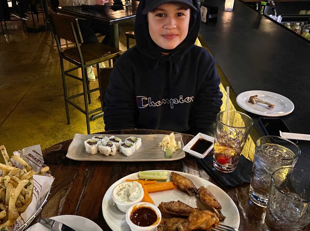 Finn has been asking for a tuna avocado maki roll and truffle fries from Minglewood Harborside for weeks now. We’ve ordered take out twice recently, but he wasn’t home either time. So, last night while Thatch was on the ice for practice, Finn and I ran over for a quick dinner. With an added order of wings along with his fries and sushi….and the Bruins game on one TV with the Milwaukee Bucks (he’s got a thing for #34 Giannis Antetokounmpo) on another, Finn was a happy camper. I had my go-to favorite, the Gloucester Roll, and it was phenomenal as always!