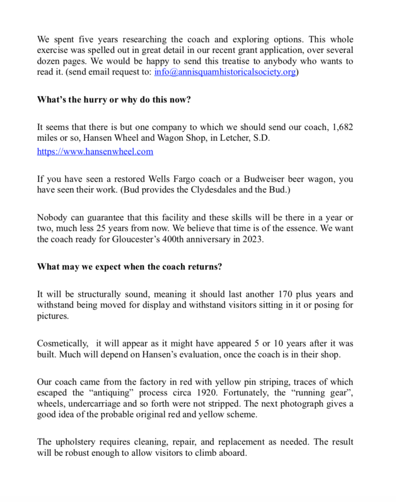 Here is the link to Annisquam Historical Society, please visit the page to learn more about the coach and other fascinating Annisquam historical stories and their “Notes from the Firehouse,” but I have also included screen shots of their pages for easy viewing.