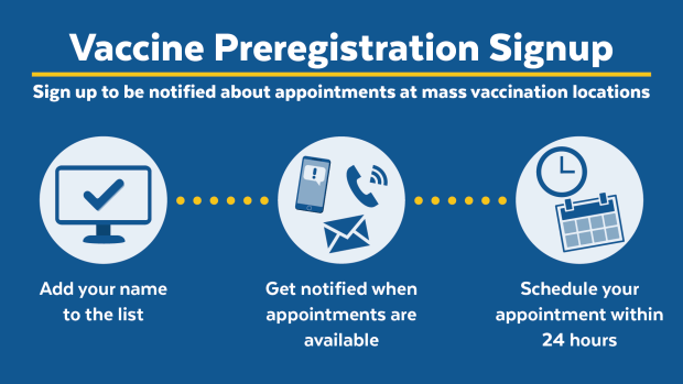 The State has developed a new preregistration system for those seeking vaccine appointments. Beginning tomorrow, Friday March 12, you can sign up and be enrolled in a virtual queue to be notified when an appointment is available for you at one of the mass vaccination sites. Residents are cautioned that it may take several weeks for an appointment to become available, but this seems like an opportunity to ease some of the anxiety caused by trying to obtain appointments in the current method. To learn more: https://www.mass.gov/info-details/preregister-for-a-covid-19-vaccine-appointment When a link to the preregistration is available, we will provide it (tomorrow)