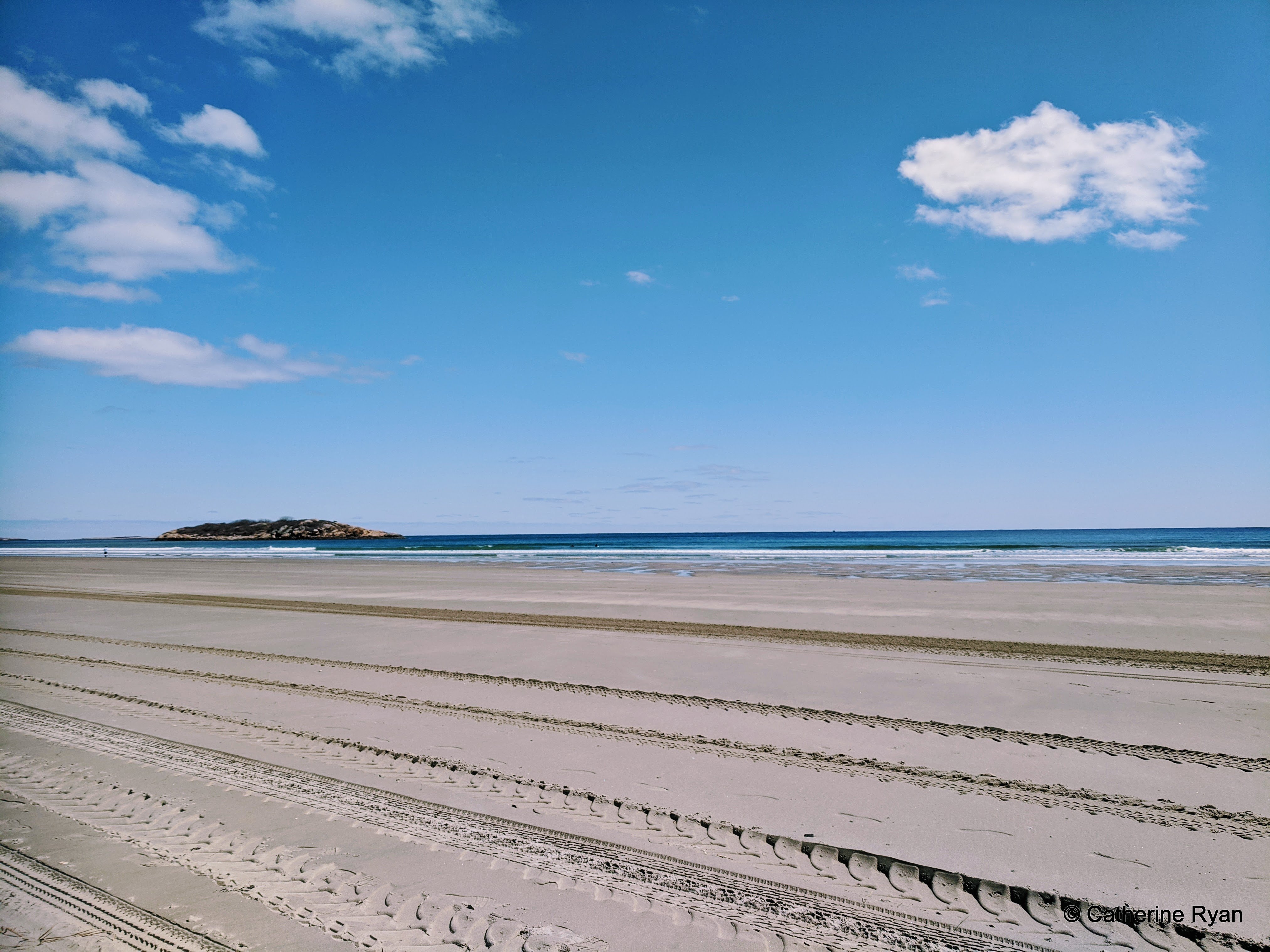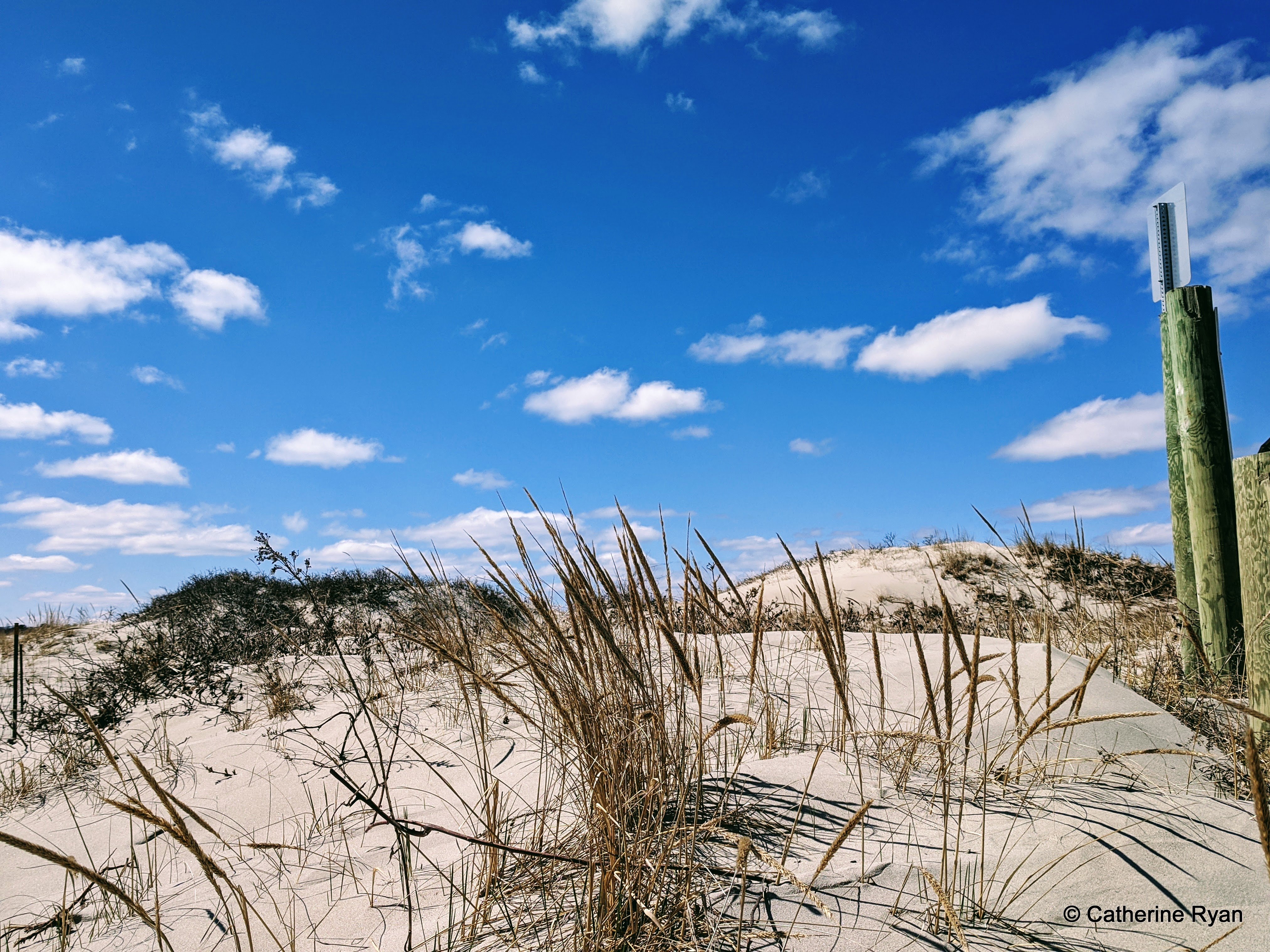 Signs of Spring- No dog rule commences April 1 on Good Harbor Beach. Piping Plovers are on the beach. Two enclosures help the wildlife and dunes. Sand felt warm underneath despite the frosty spring morning.