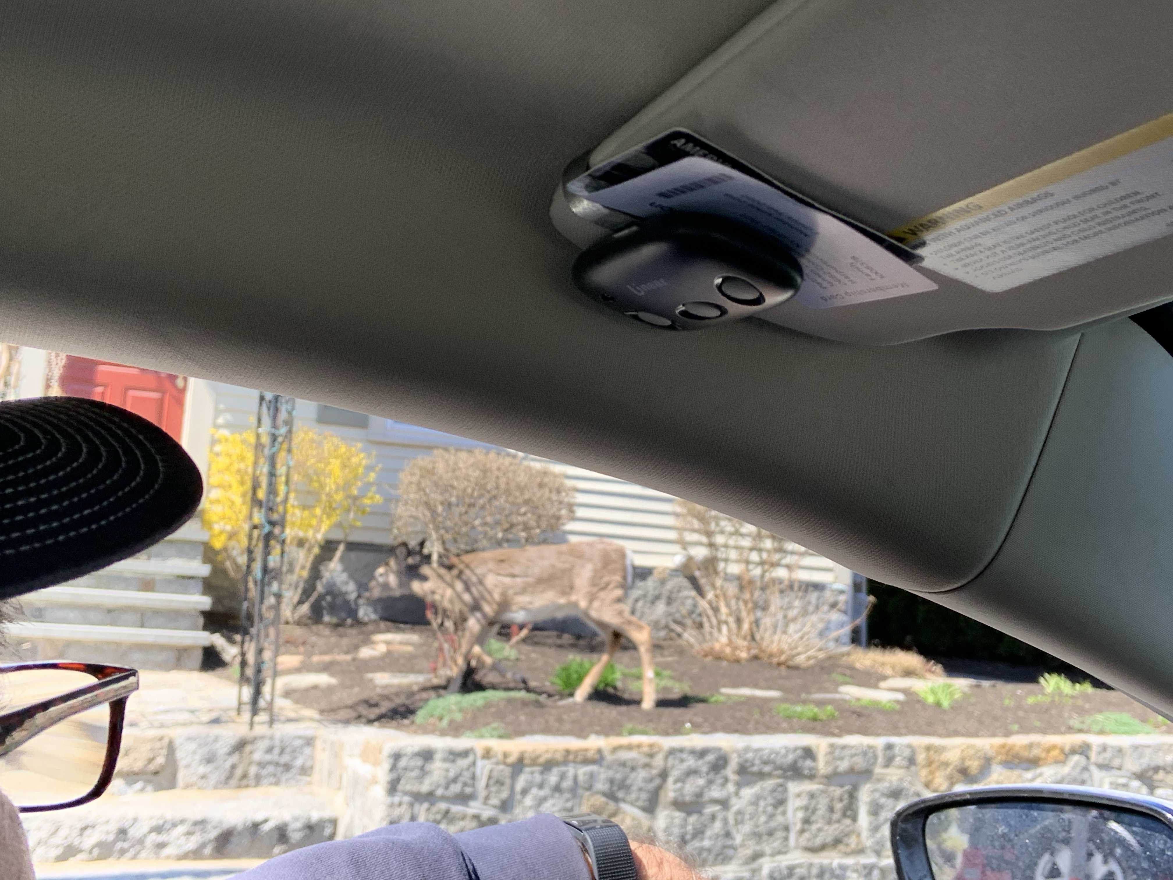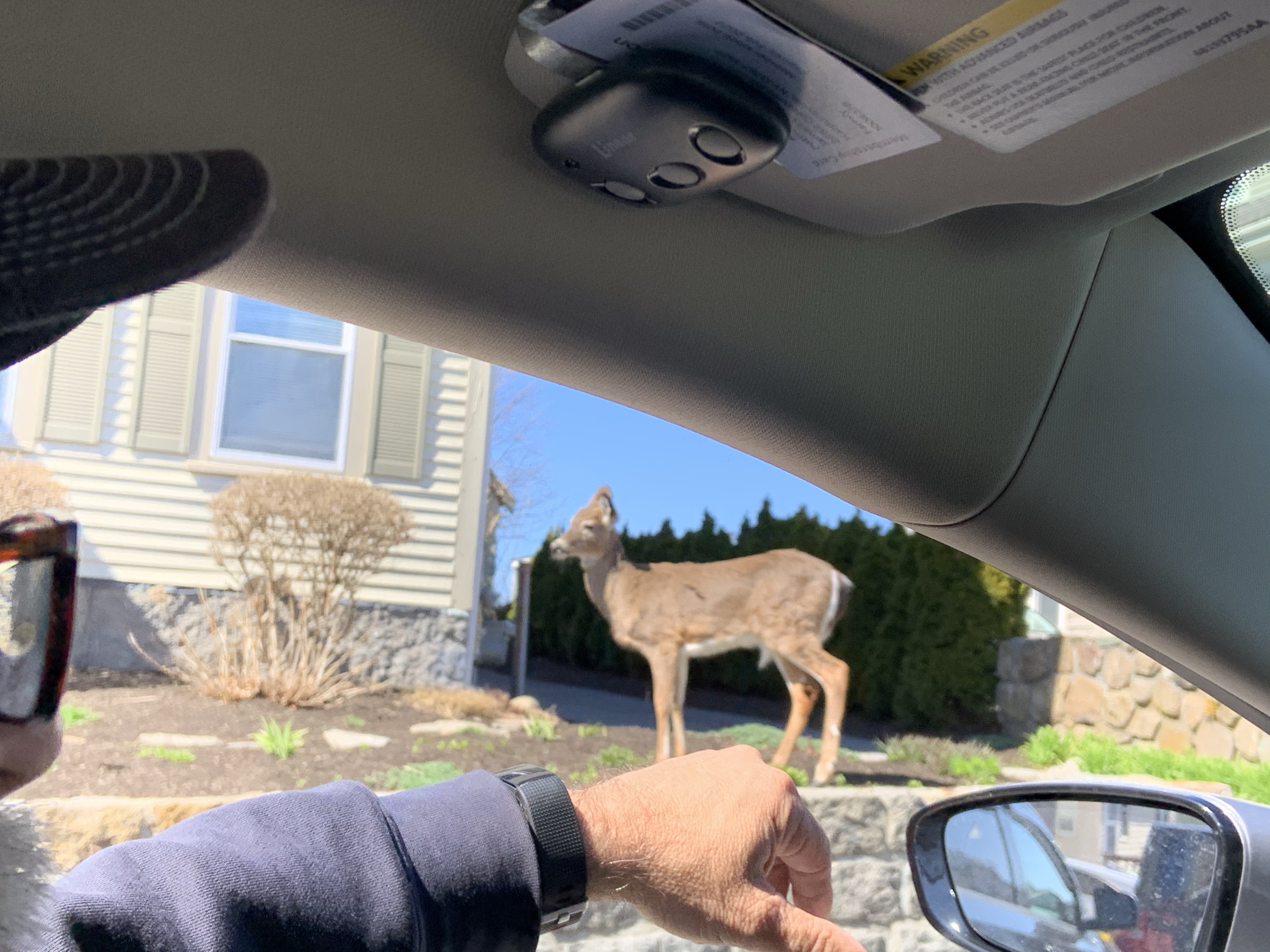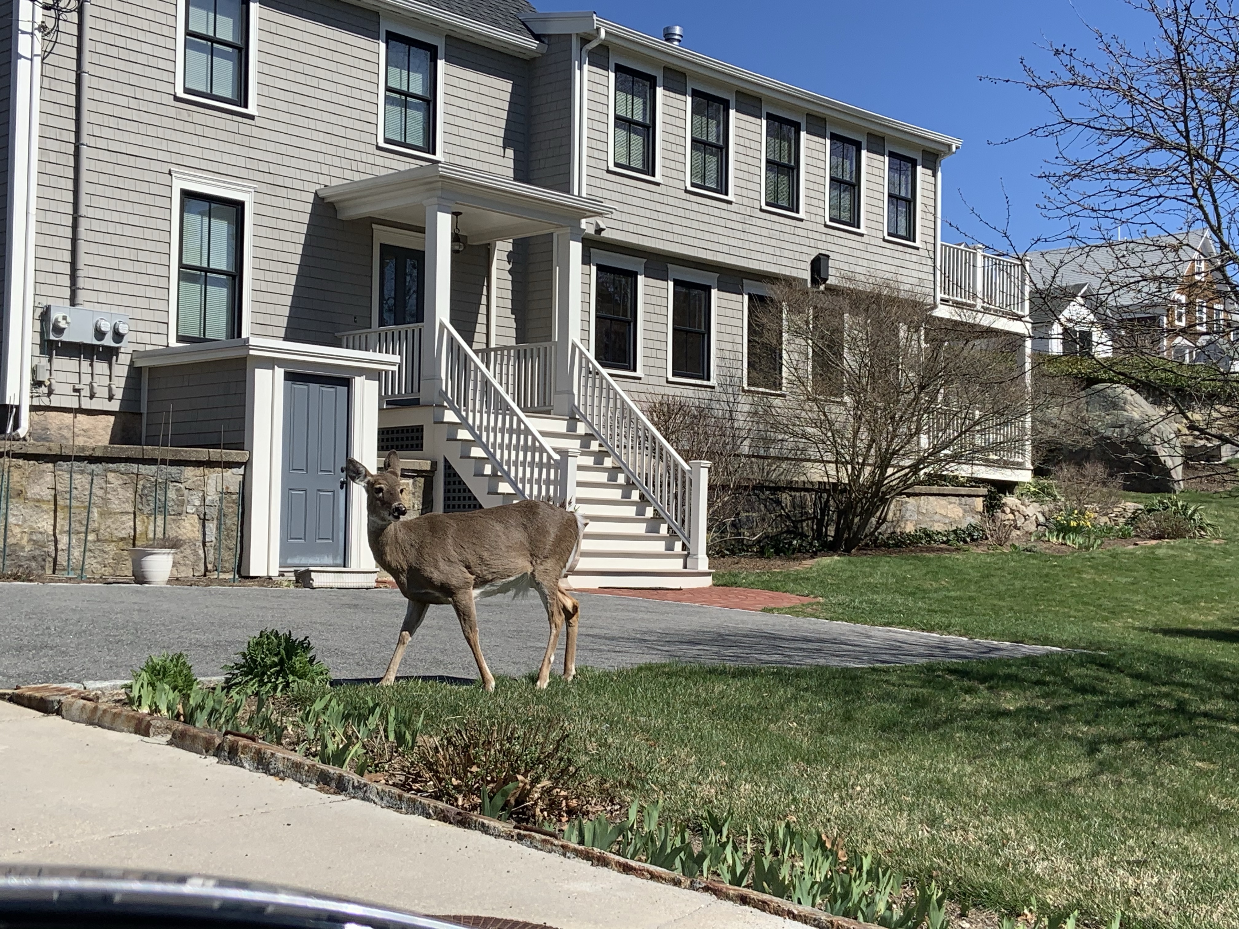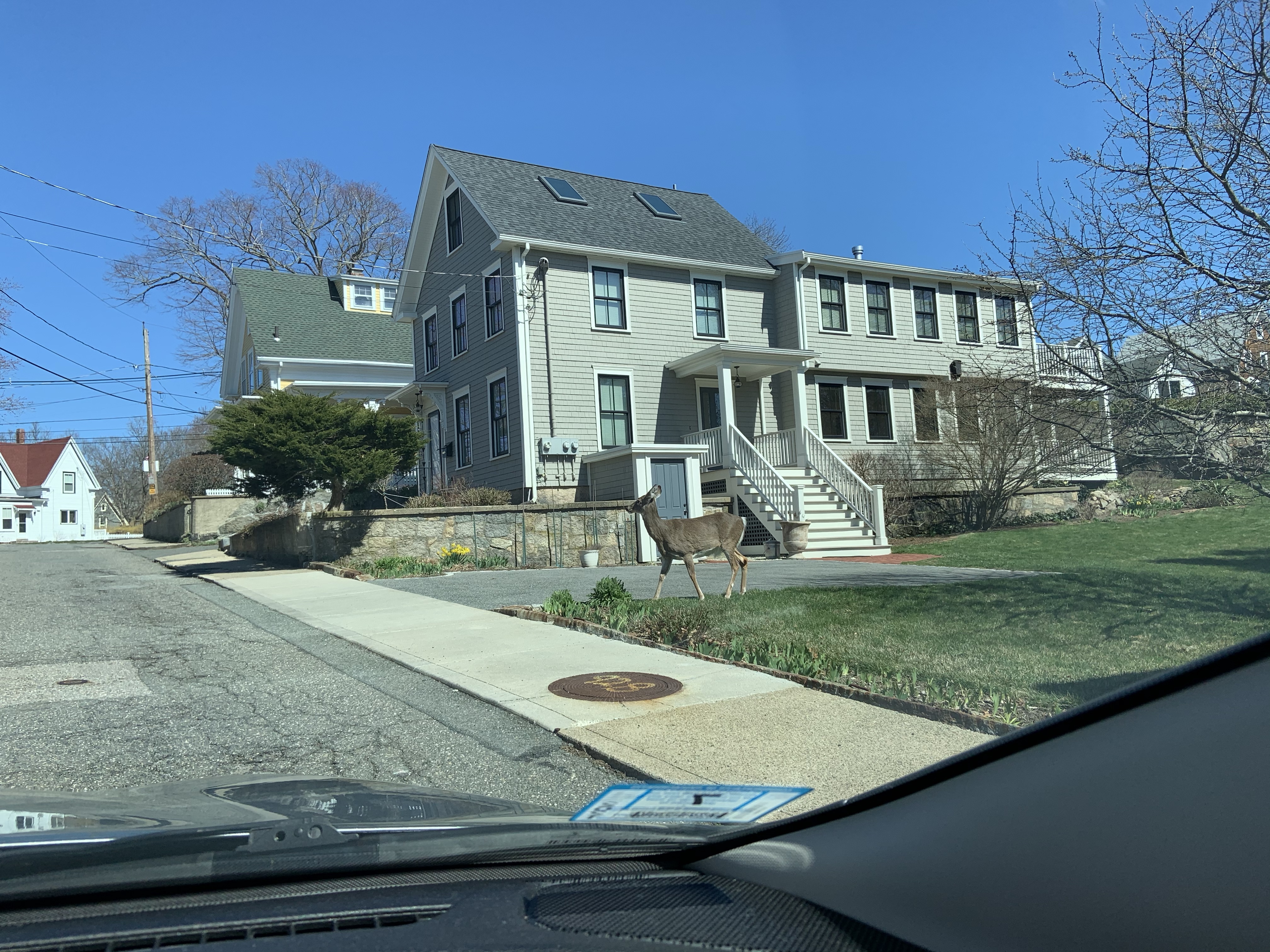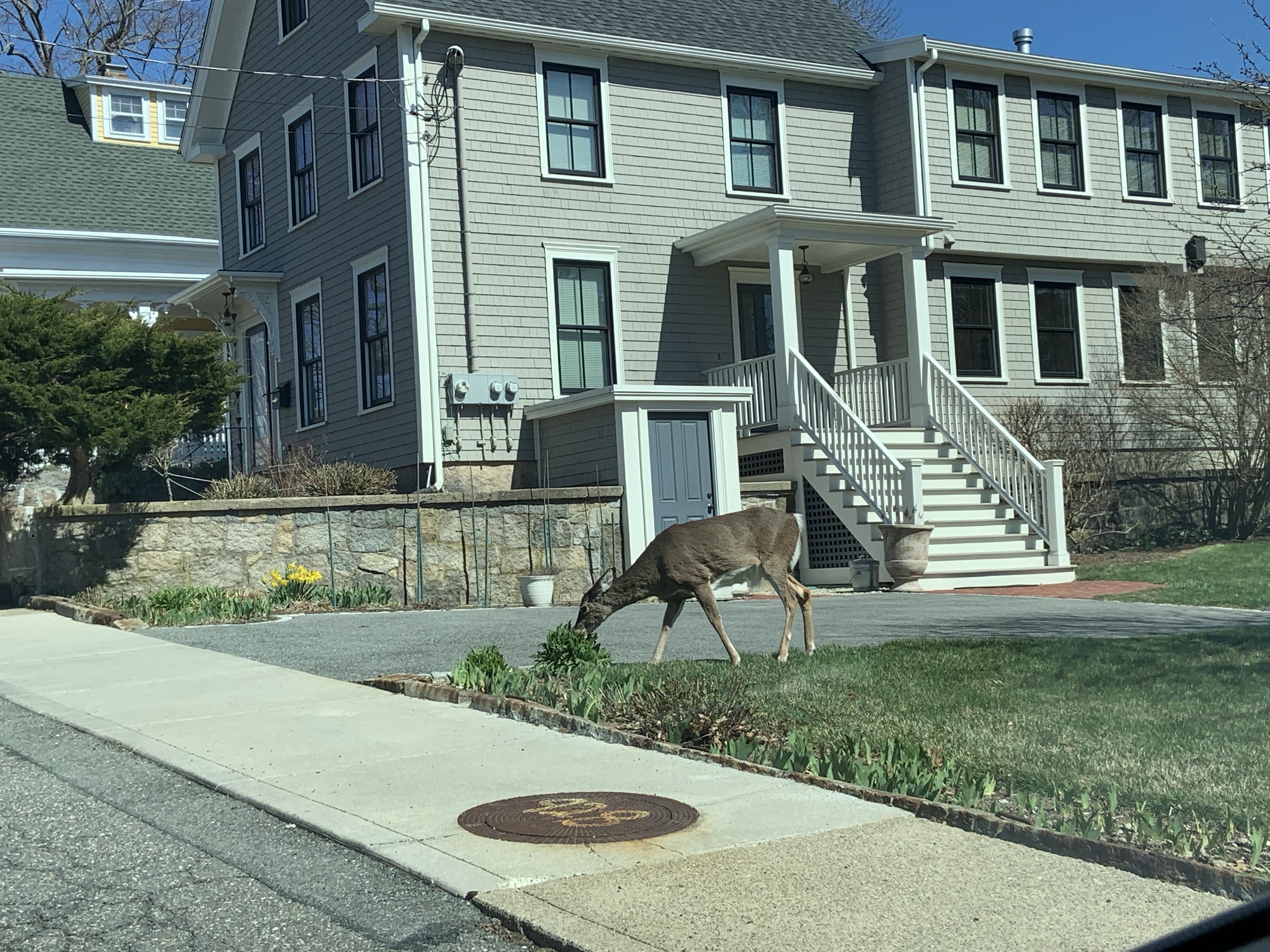 We almost missed brunch in East Gloucester yesterday. Darn deer eating new spring growth right along the street. These are obviously taken from the car, but 3 deer were having themselves a spring feast.