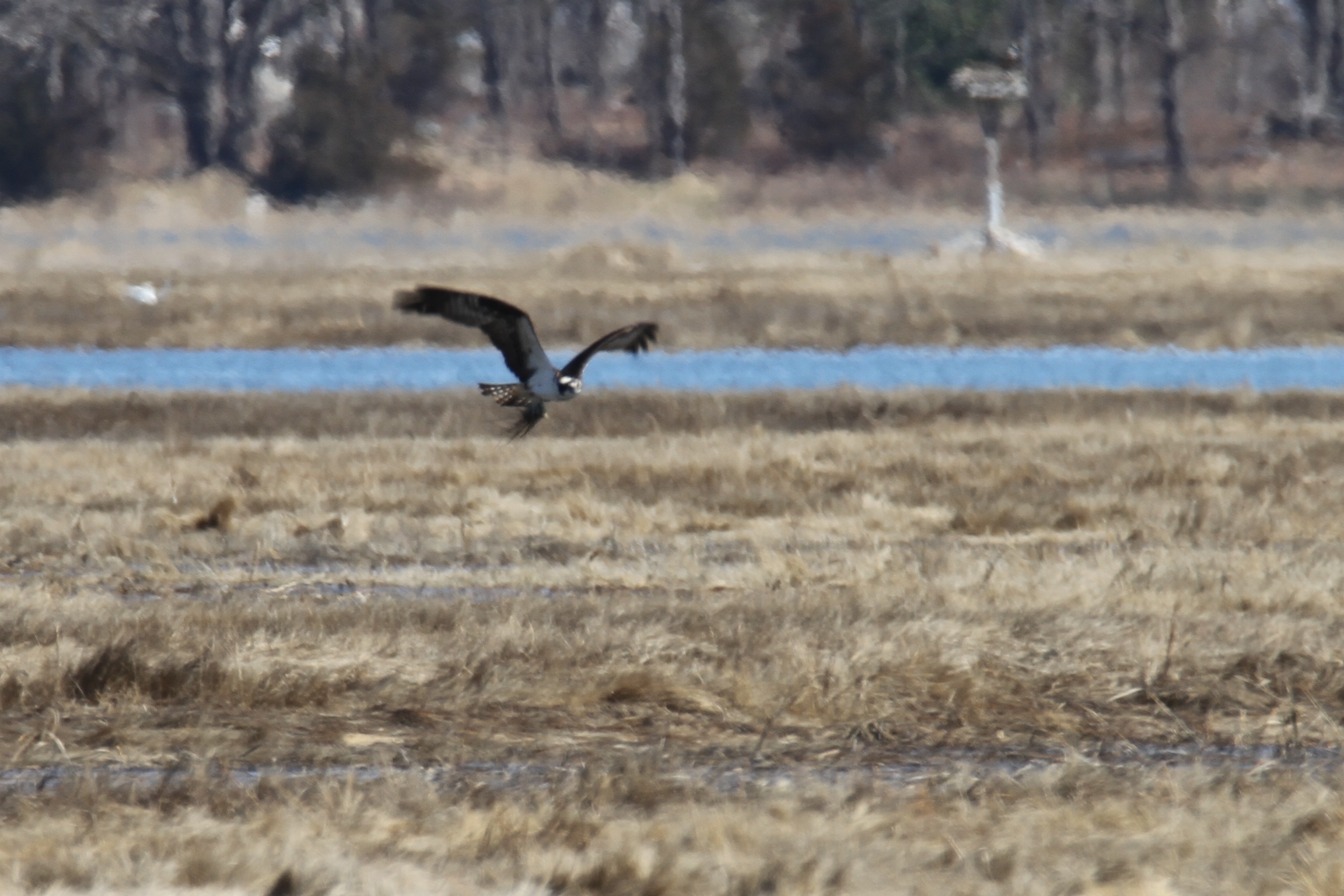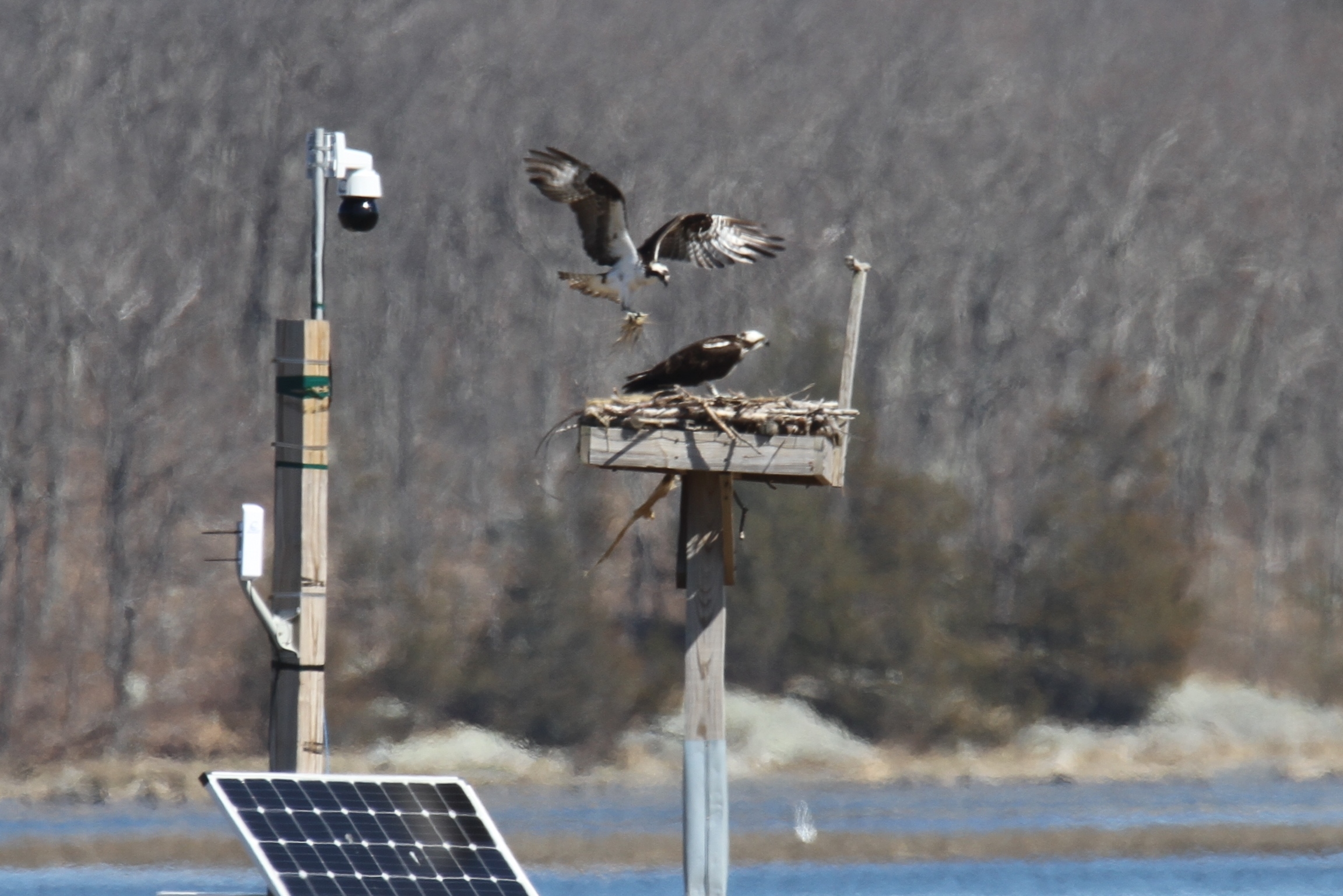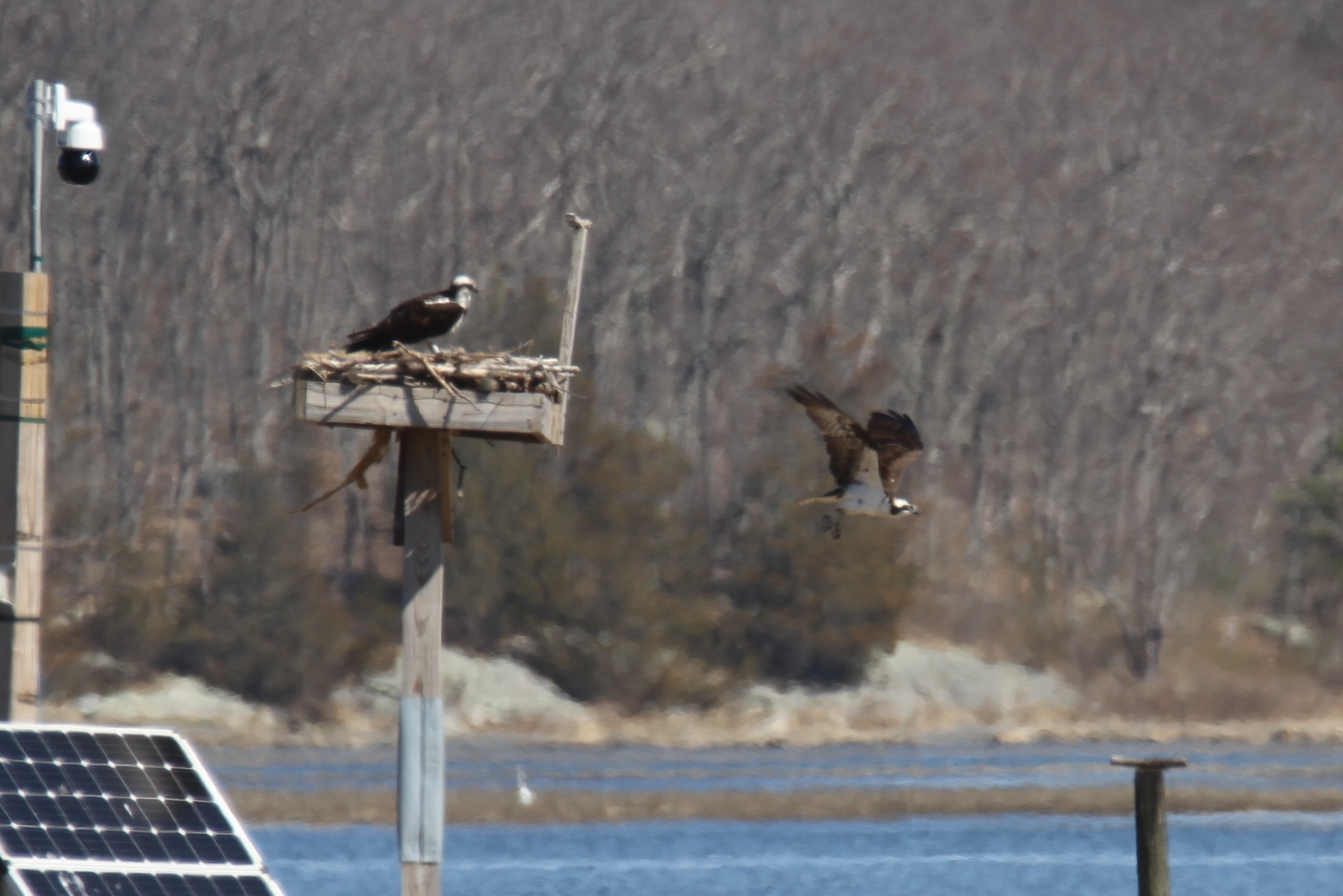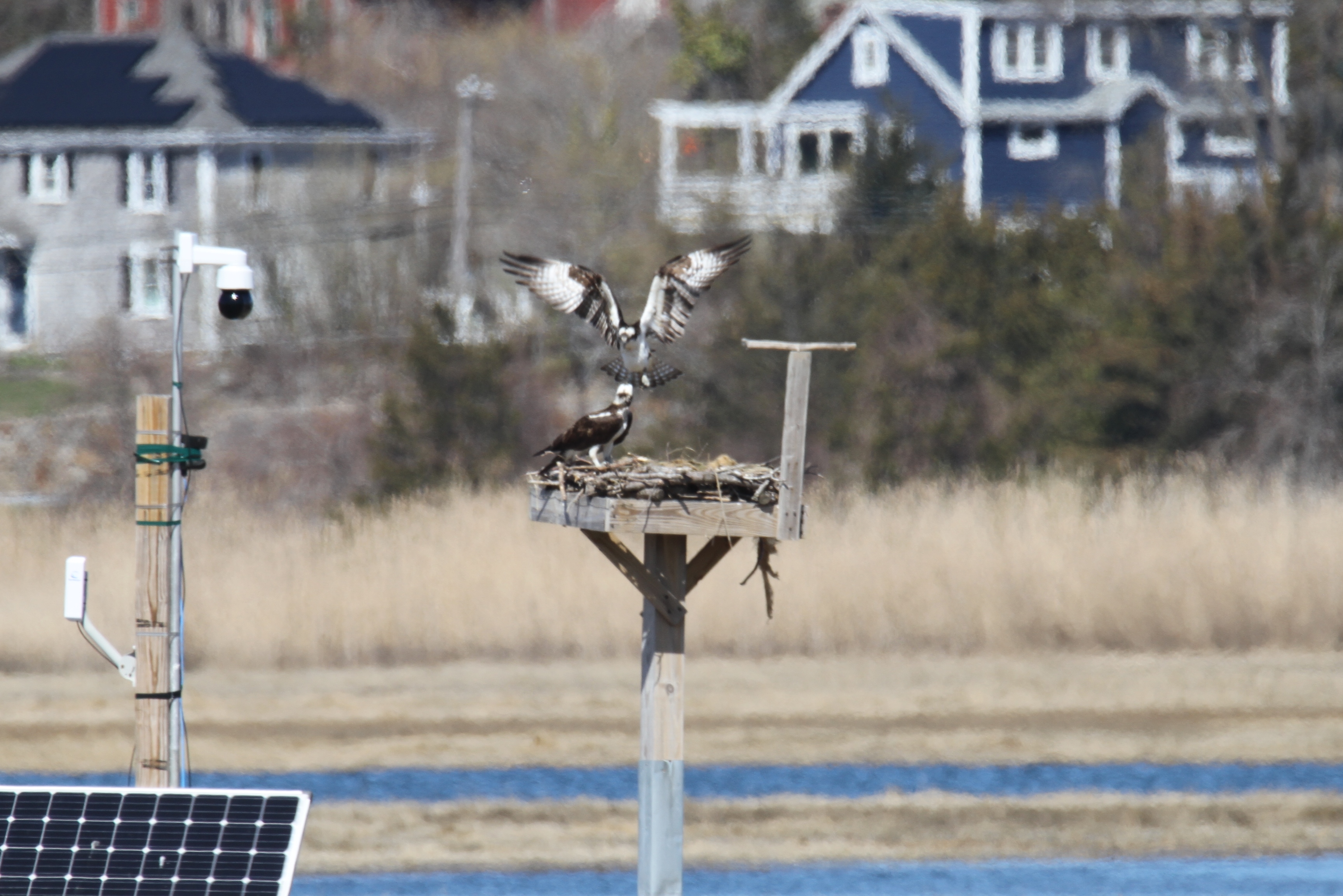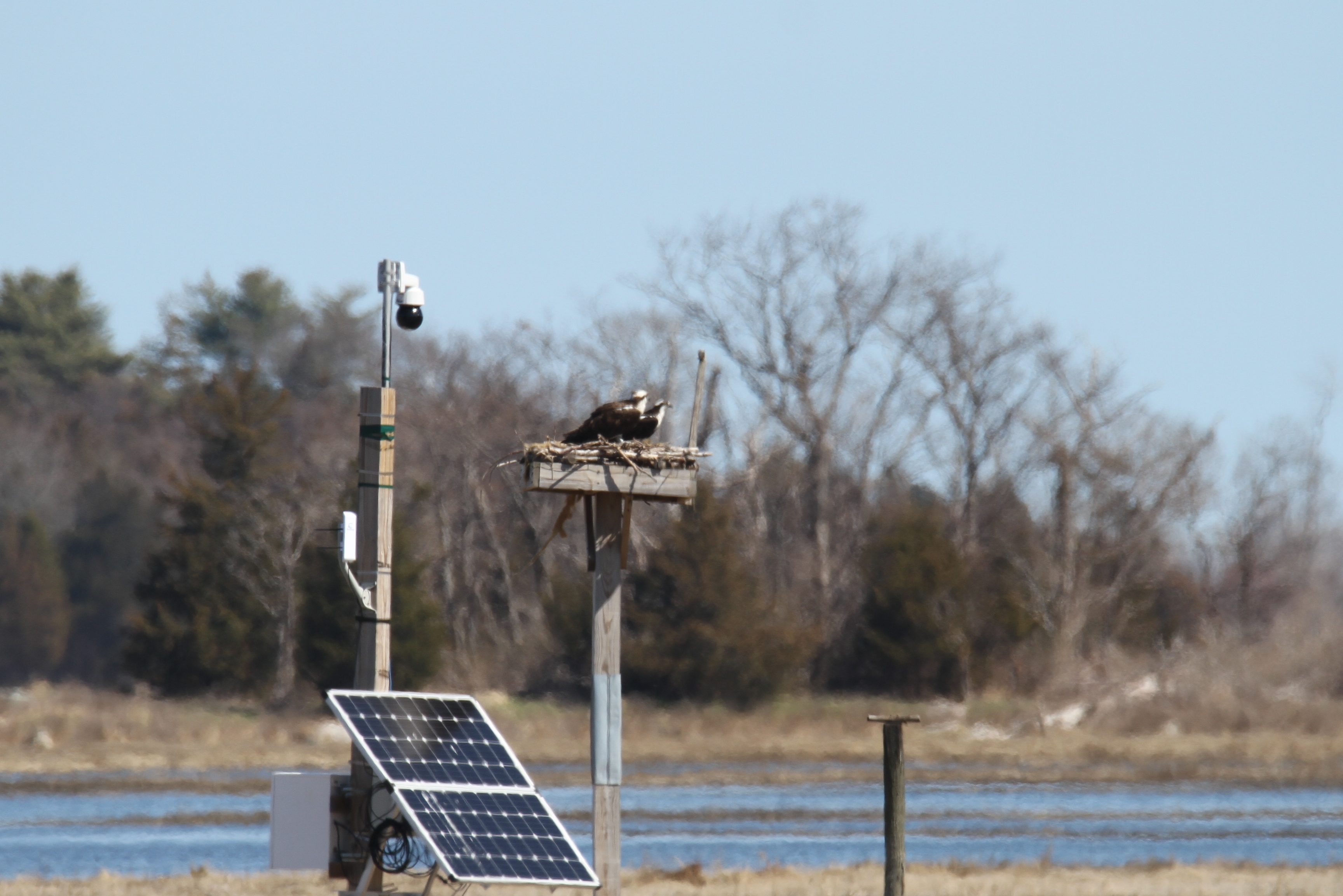 They are back and tending to the nest behind Lobsta Land! The osprey pair was spotted yesterday together in the nest. One flew off and returned with nesting material while the other worked on nest maintenance. This happened a couple of times in the half hour or so that we watched. We may also have observed some courting behavior. The nest is just a little out of reach for my lens, so I have sacrificed some clarity for closeness. They are so fun to watch. Lucky for us, the Essex Greenbelt Osprey Cam makes it easy to watch live. There is a current nest photo on the site but I am not sure the camera is live yet. Watch it here for clearer footage: https://ecga.org/Osprey-Cam