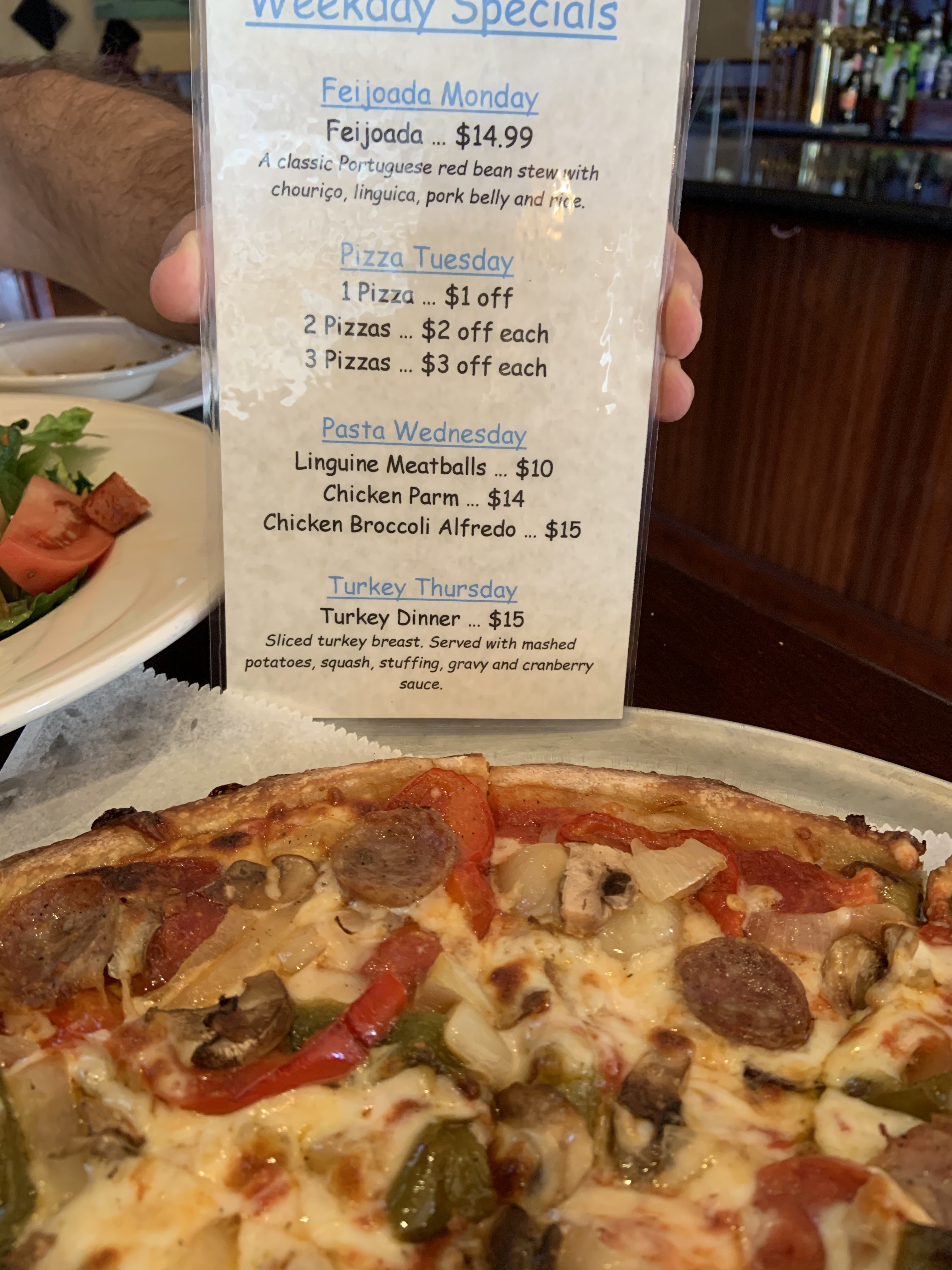 It was my lucky day this week when we stopped at the Azorean Restaurant on Washington Street for a little dinner. The weekday special was pizza, which was exactly what I was craving. When we talk about favorite pizzas, the Azorean doesn’t come straight to mind for many of us, but I think it’s a very tasty choice (among many many tasty choices on their menu). That it was on special was a bonus! We ordered bread and oil to start. Jim had the Azorean salad and we shared some Italian pizza. It was a lovely relaxed experience with the staff following all safety protocols.