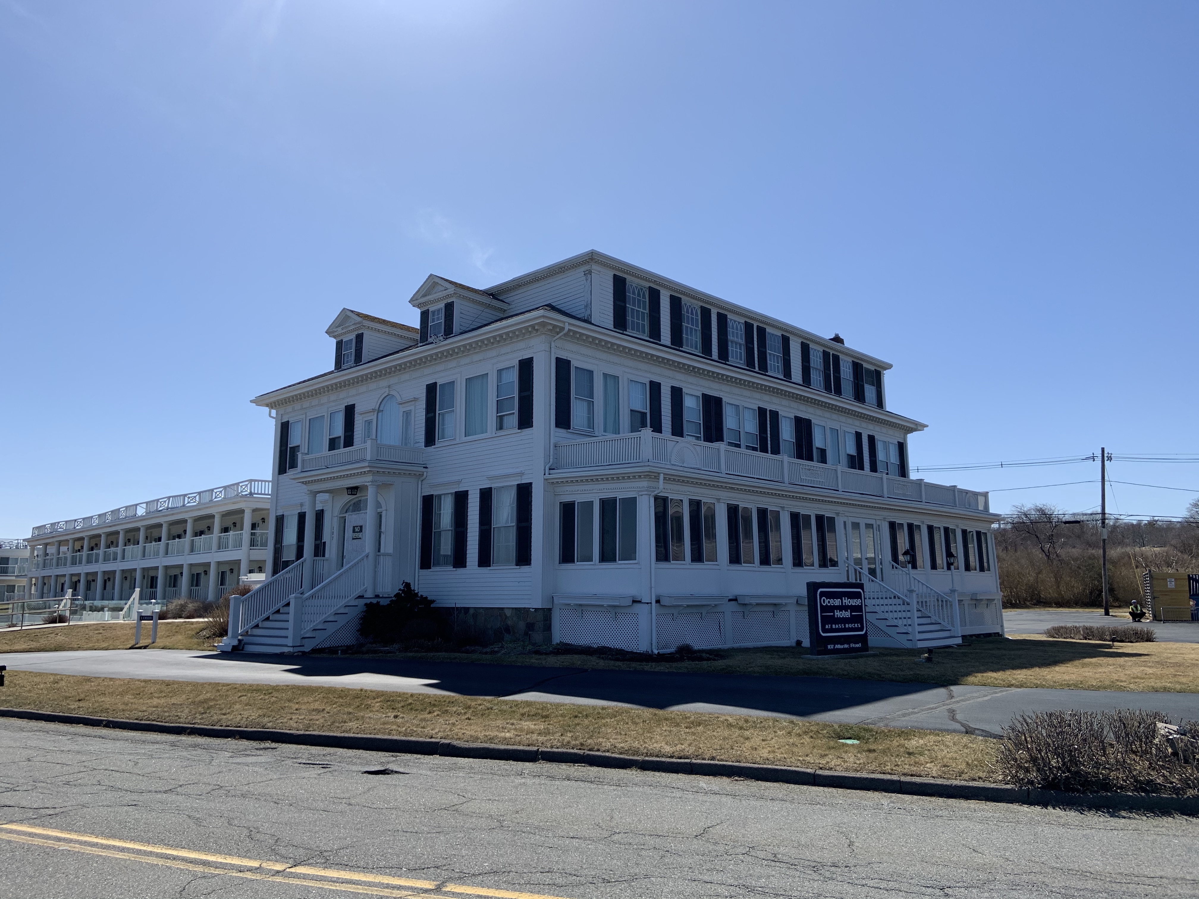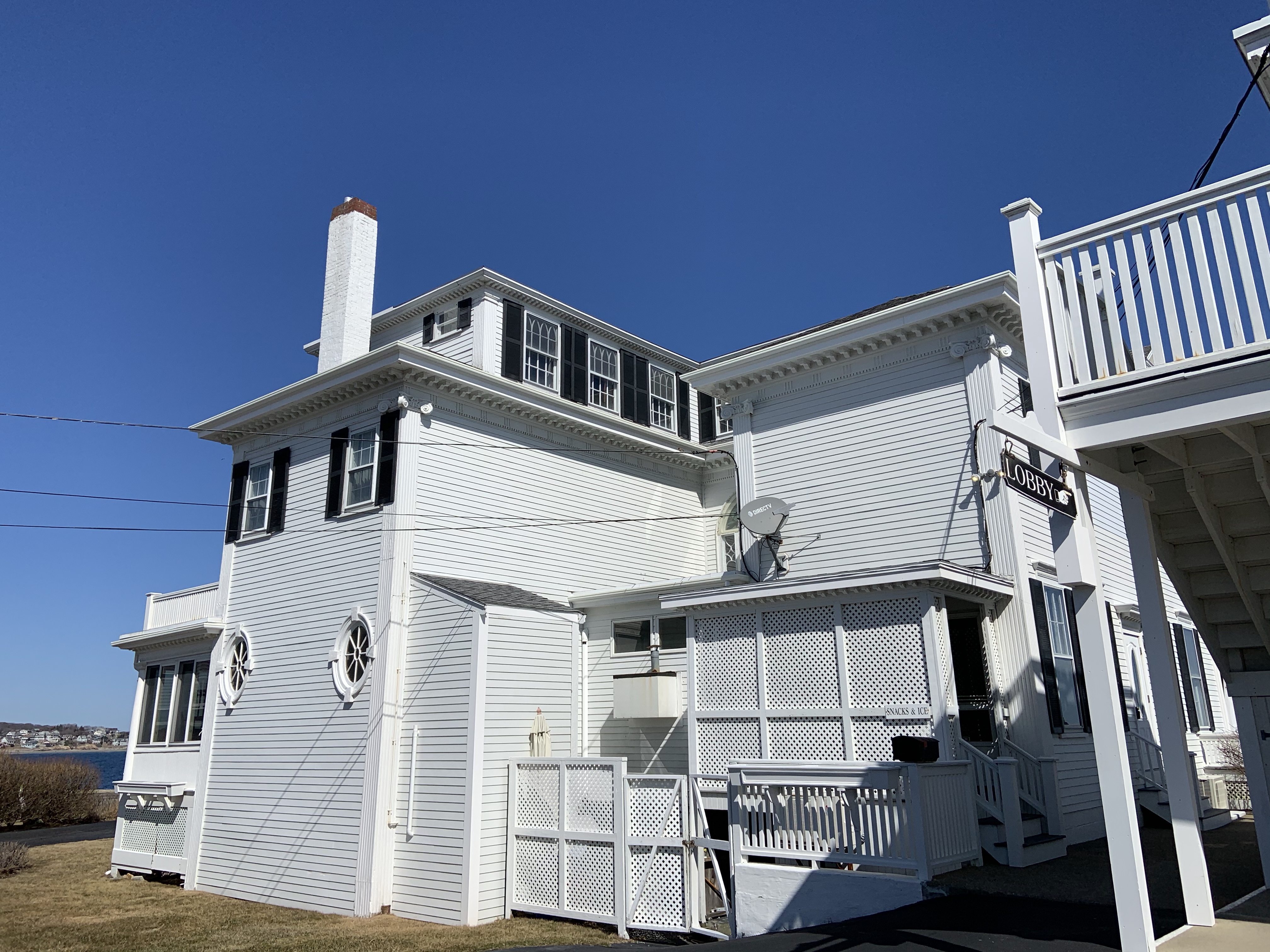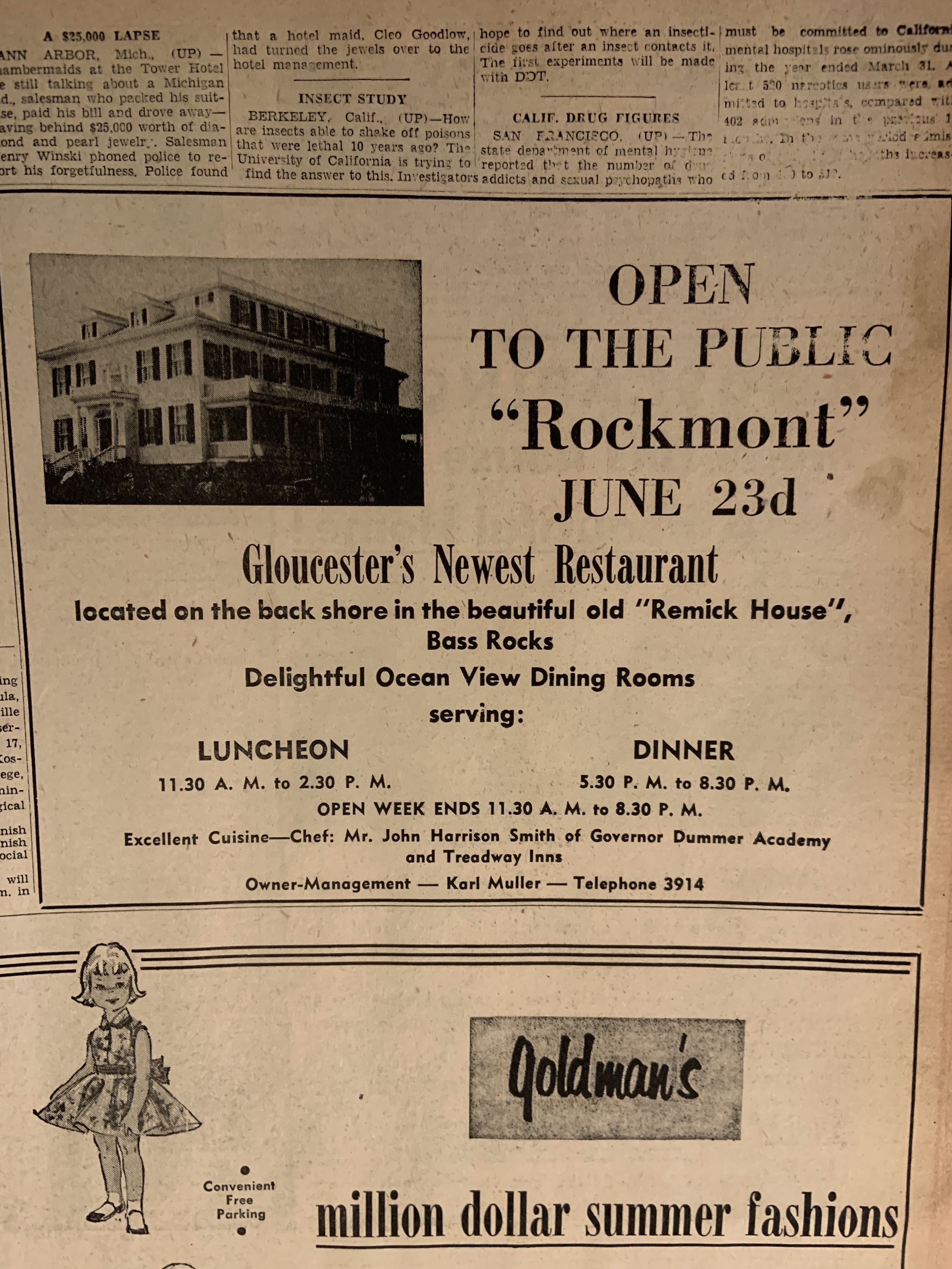 The April and June 1956 Gloucester Daily Times featured these advertisements for the Remick House and its accompanying restaurant Rockmont. It struck me that the current building retains most of the features from the 1956 version of the hotel, although the current Ocean House Hotel at Bass Rocks offers continental style breakfast only. The windows on the back side of the building seem to have come through the years fairly well. I love the detail offered in the ad regarding the chef and his training. I also love the 4 digit phone number!