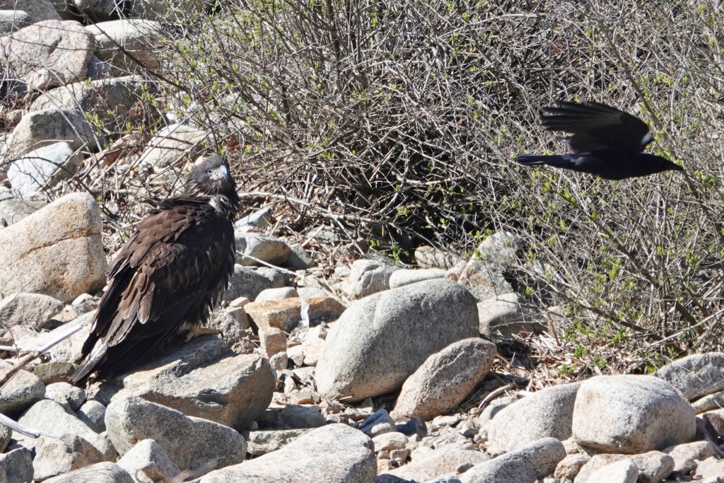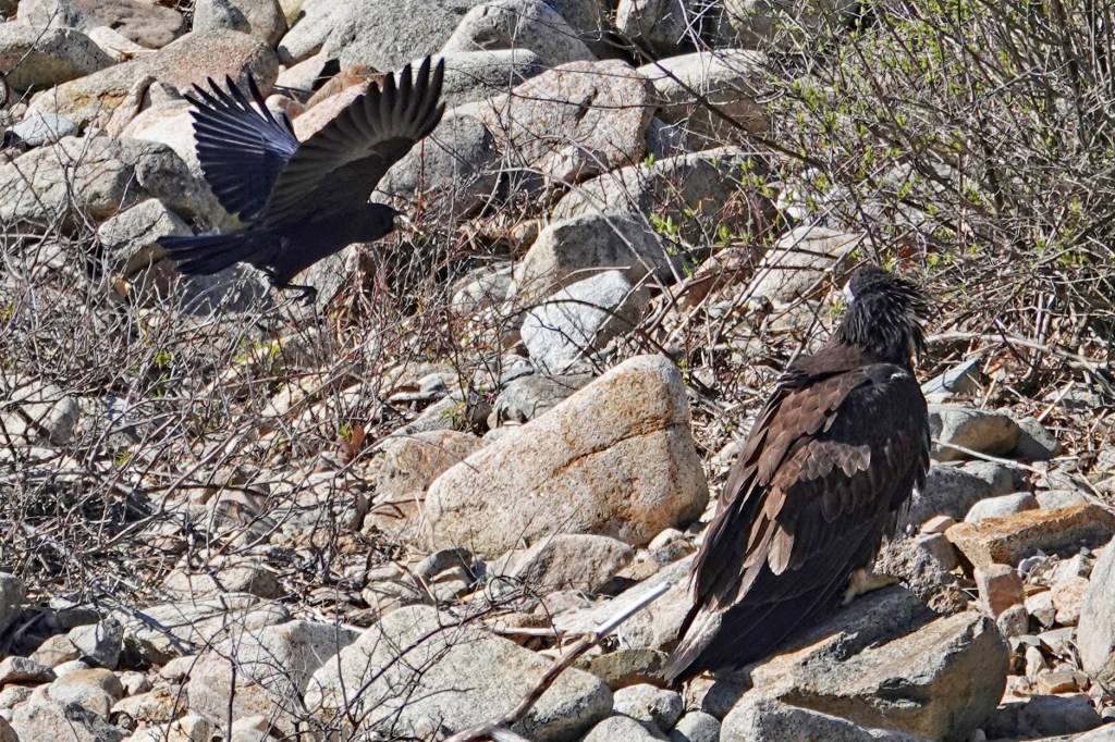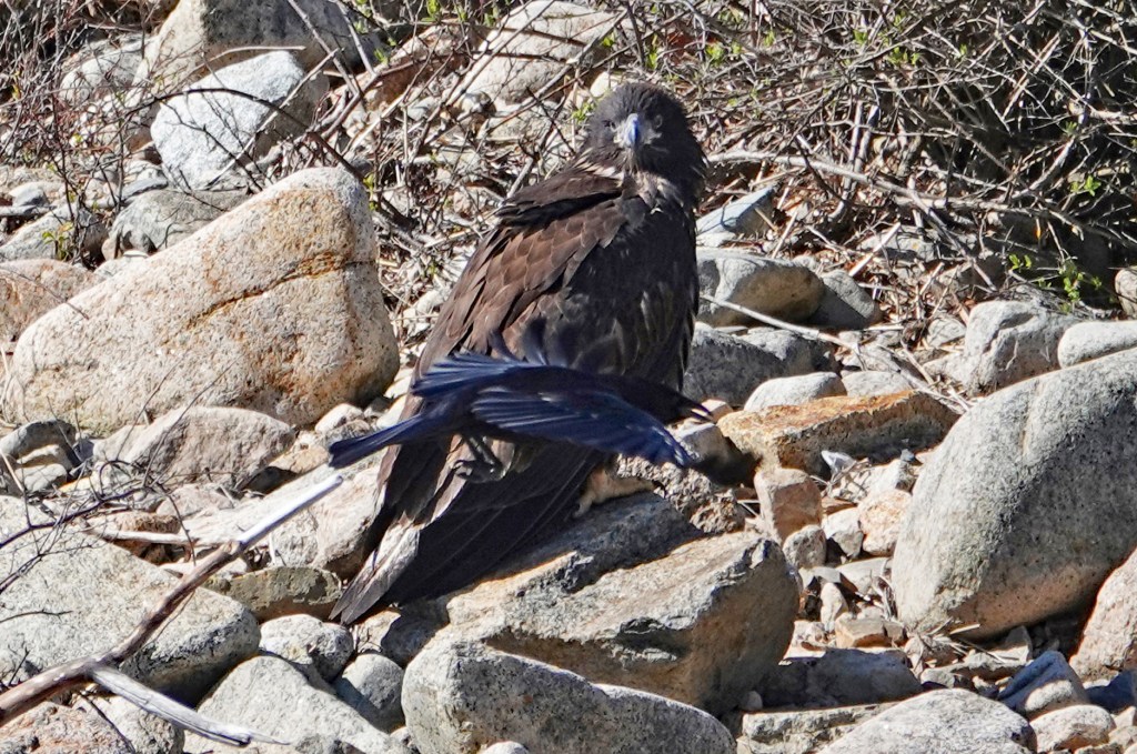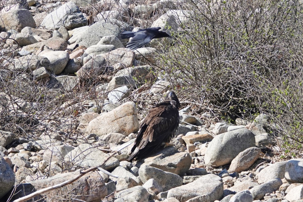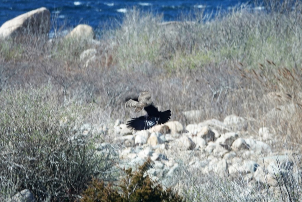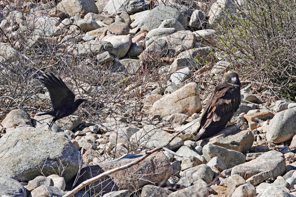 CORRECTION: Our ornitholigist daughter has just let me know the Red-tailed Hawk chased by the crows, that I posted a couple of hours ago, is actually a first-year Bald Eagle. She says the juveniles get their white heads in their 4th year. How ’bout that?