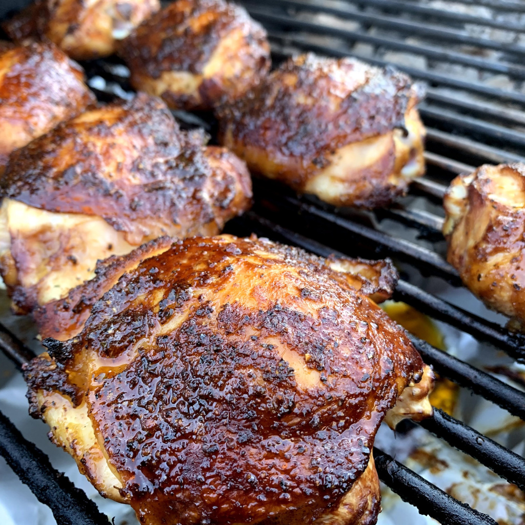 Couple of key steps- patting your chicken thighs down with paper towels, using peanut oil, and high indirect heat- 450F, they can cook til 185 internal.