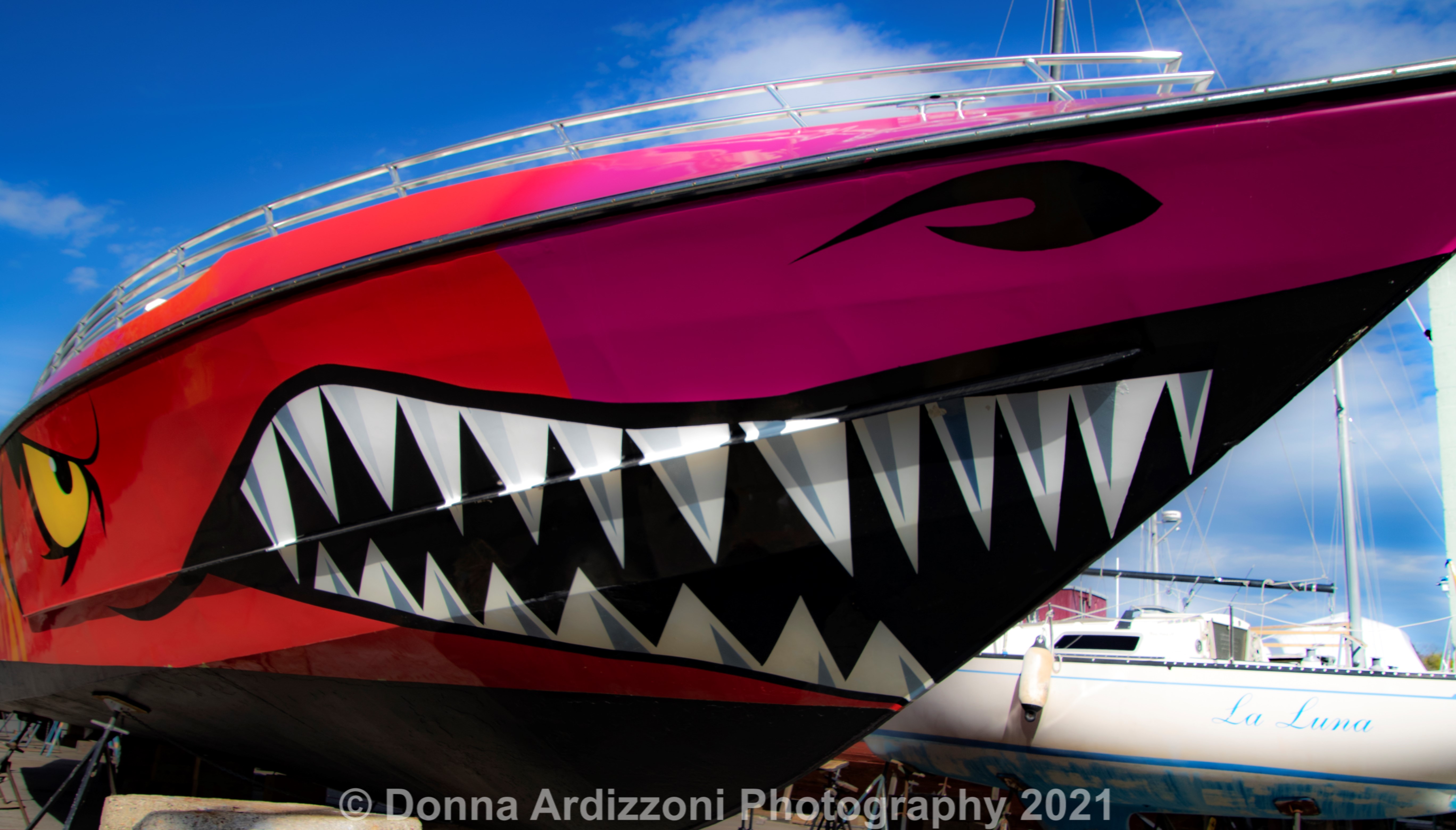The Codzilla, Boston Harbor’s fun boat, is being fixed and stored a the Marine Railway over at Rocky Neck.