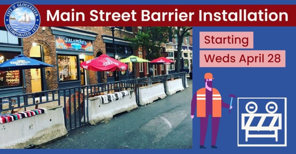 Mayor Sefatia: Please be aware that tomorrow, Weds 4/28/21, City of Gloucester Public Works will be placing barricades on Main Street to help with outdoor dining for summer 2021. Please refer to the special signage that will be put on Main St. regarding parking restrictions, times and other info. The Community Development / Innovate Gloucester team has shared this notice with businesses to help prepare, too.