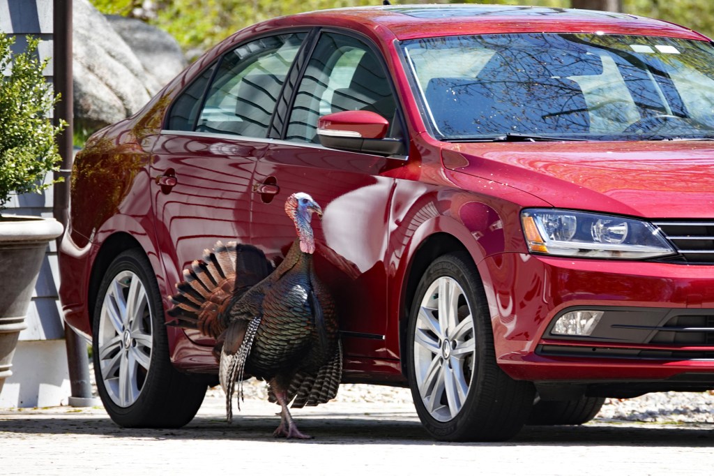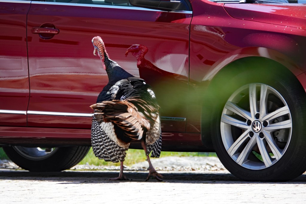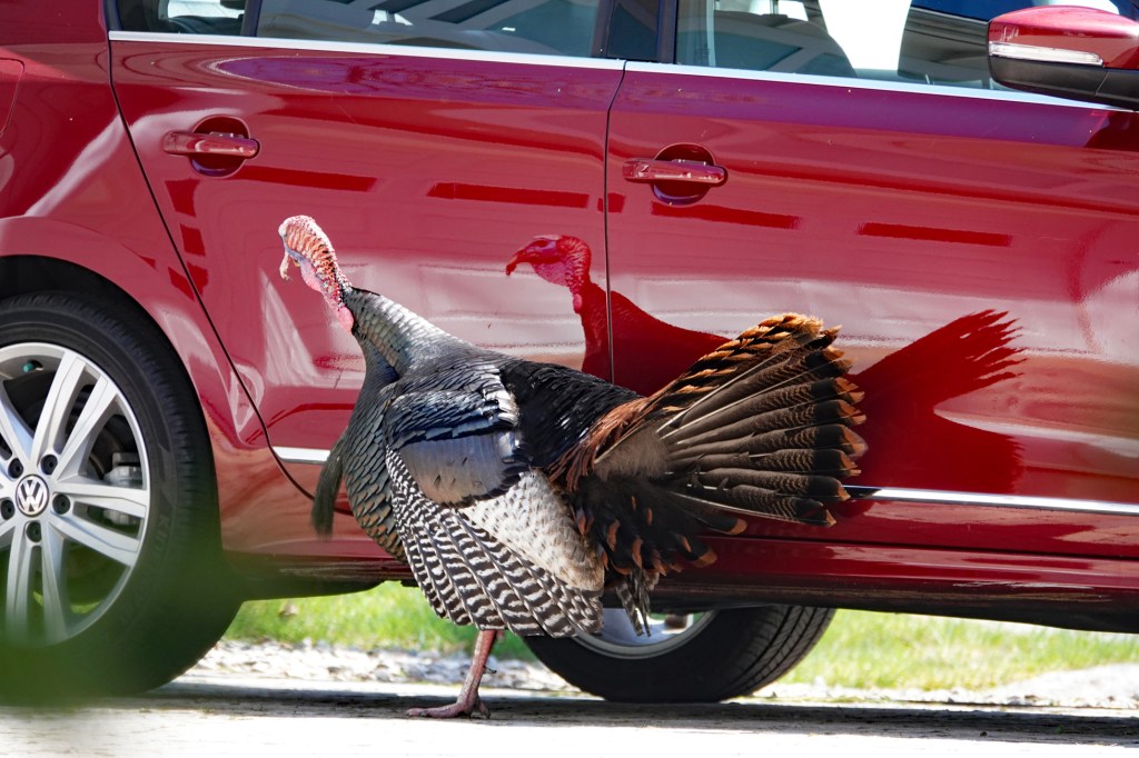 Our adult male turkeys are still courting the women, while one of the younger students encountered an intruder with red feathers. We moved on before he gave up pacing back and forth.