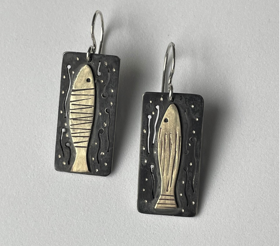 Jeweler Katherine Bagley fuses metals in her earrings, creating brass fish on an oxidized sterling silver background.