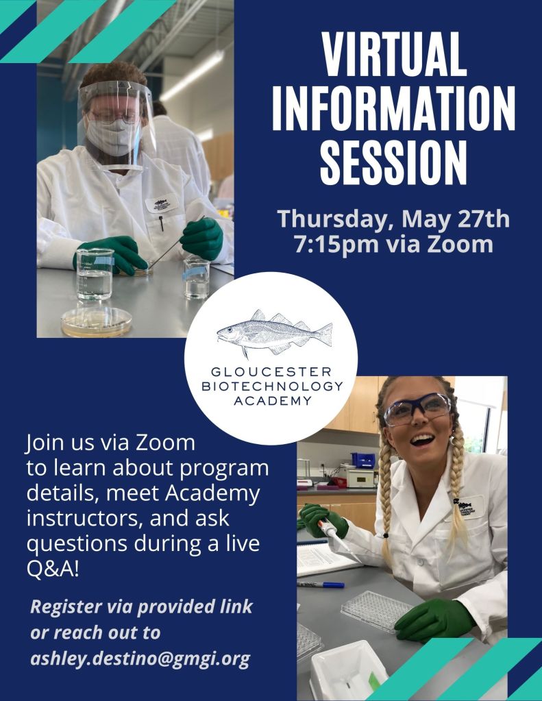 Join us on Thursday, May 27th at 7:15pm via Zoom to learn more about Gloucester Biotechnology Academy’s hands-on training program that provides young adults with the skills needed to start a career in biotech. This is a webinar, so all you have to do is log in and listen – we wont be able to see or hear you (unless you submit a question for Q&A)!
