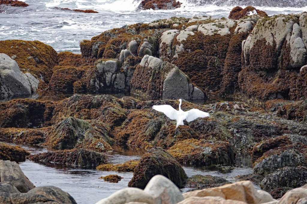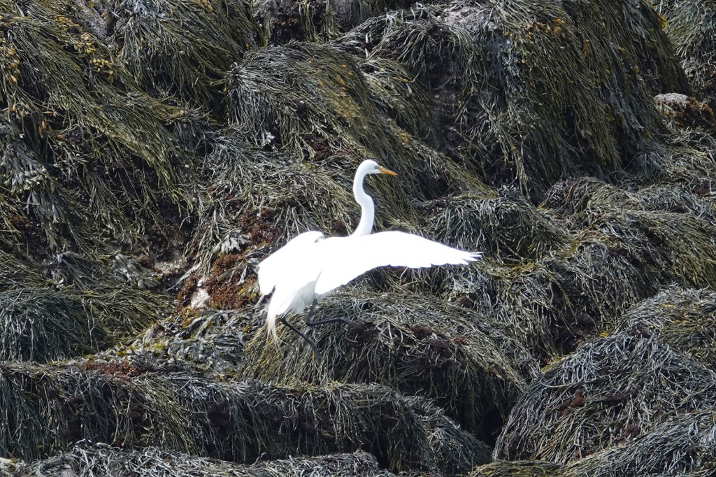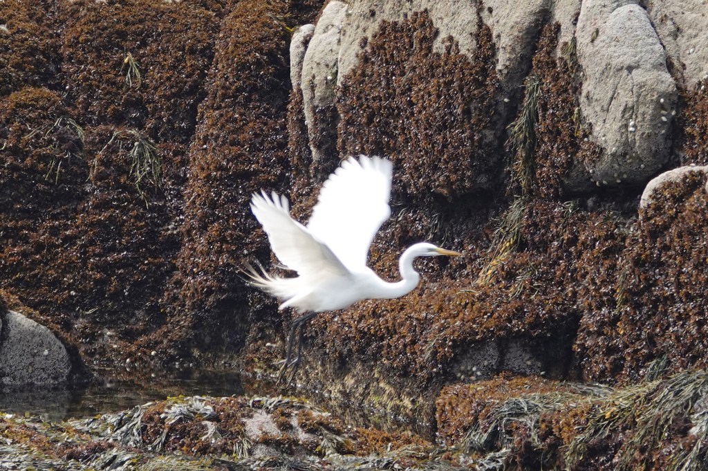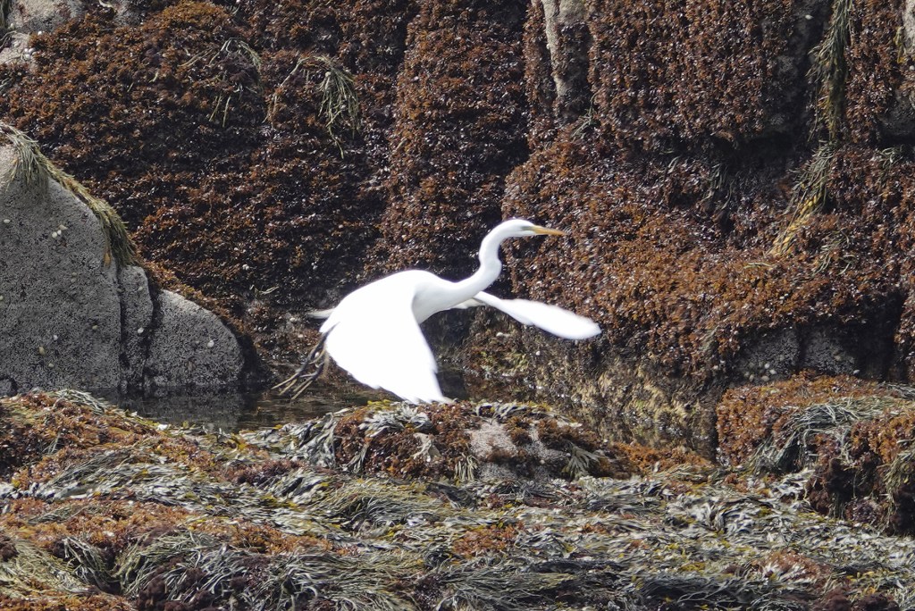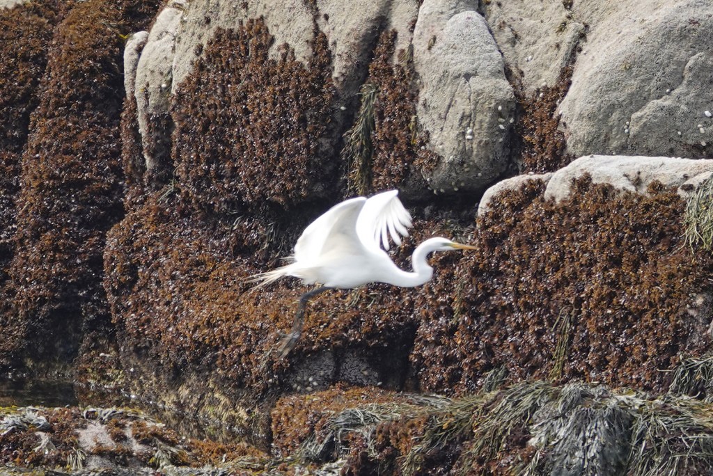 Summer! Edward, our Great White Egret, is back flying around the rocks for his low-tide lunch.