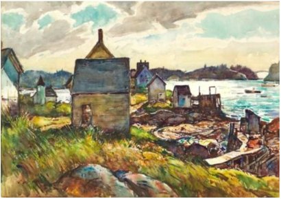 W L Stevens watercolor fishing shacks Annisquam River Gloucester MA sold at auction 2005