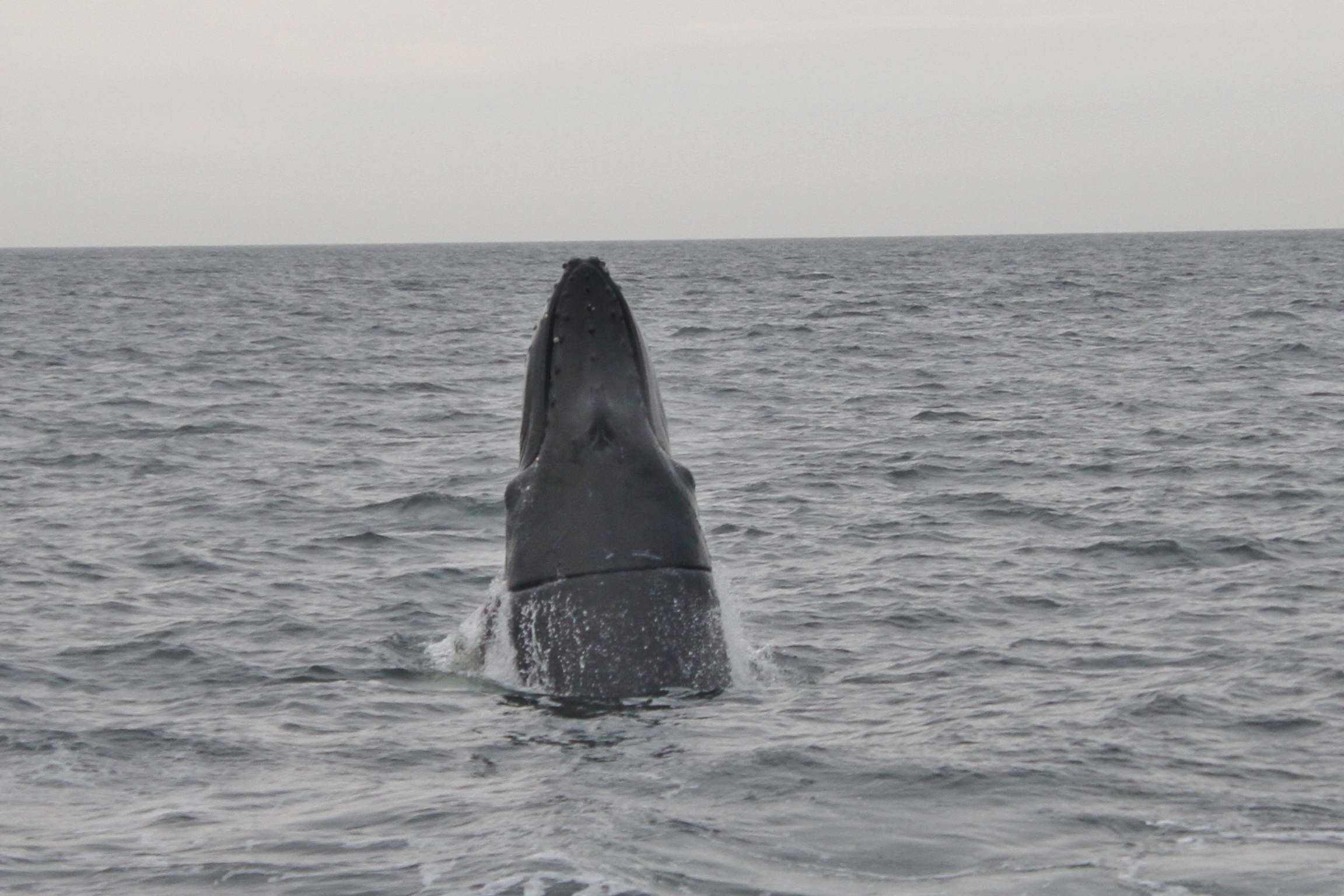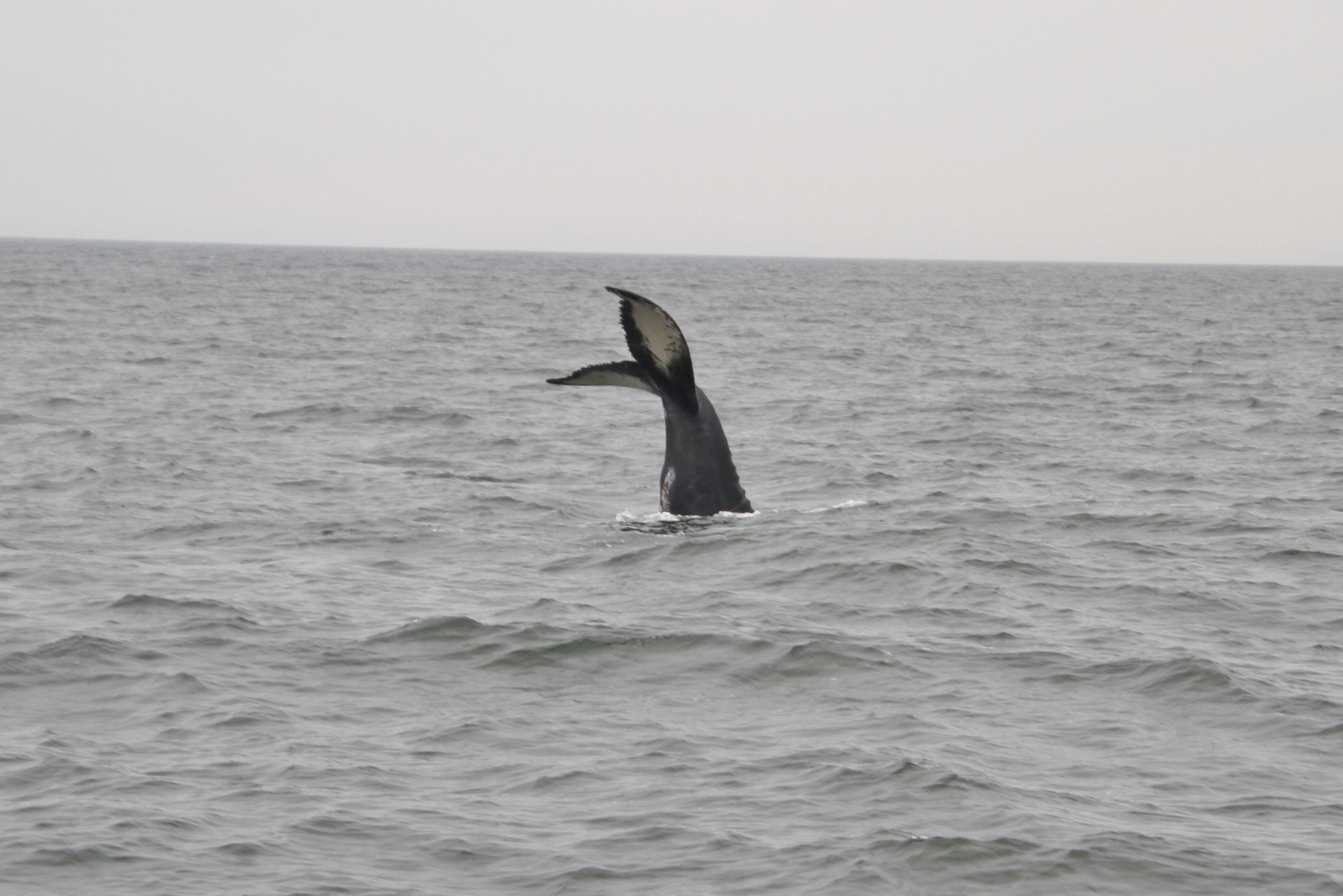 Several family groups including a number of excited children were also aboard, as were photographer friends Jessica and Melissa. Tina was our naturalists, Capt John was at the helm and several interns were along to make our trip successful (shout out to intern Keirsten!) . Although my expectations were VERY low, we did make our way out to the feeding grounds and spent time with Jabbaroo and her calf. The calf was super-playful displaying behaviors such as chin breaching, pectoral slapping, AND a full spinning breach or two! This calf was recently injured in an entanglement and you can see the damage done to its body in some of these pictures. It was a life threatening injury but it appears the calf is recovering. Although the lighting was poor under clouds and light rain, we were treated to the full show and some of the pictures turned out well enough to share.