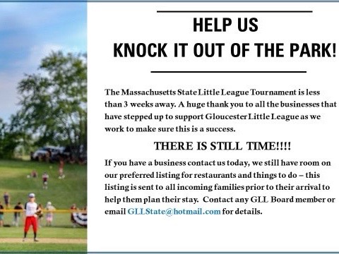The Massachusetts State Little League Tournament is less than 3 weeks away. Please consider having your business included in the preferred listing of Things to Do while visiting Gloucester! This guide to activities and restaurants will be sent to all incoming families of the players/teams who will be competing during the tournament weekend. Four teams from around the state of Massachusetts will be visiting our city that weekend…and with them come lots of friends and family members who will be looking for meals and activities during their stay!