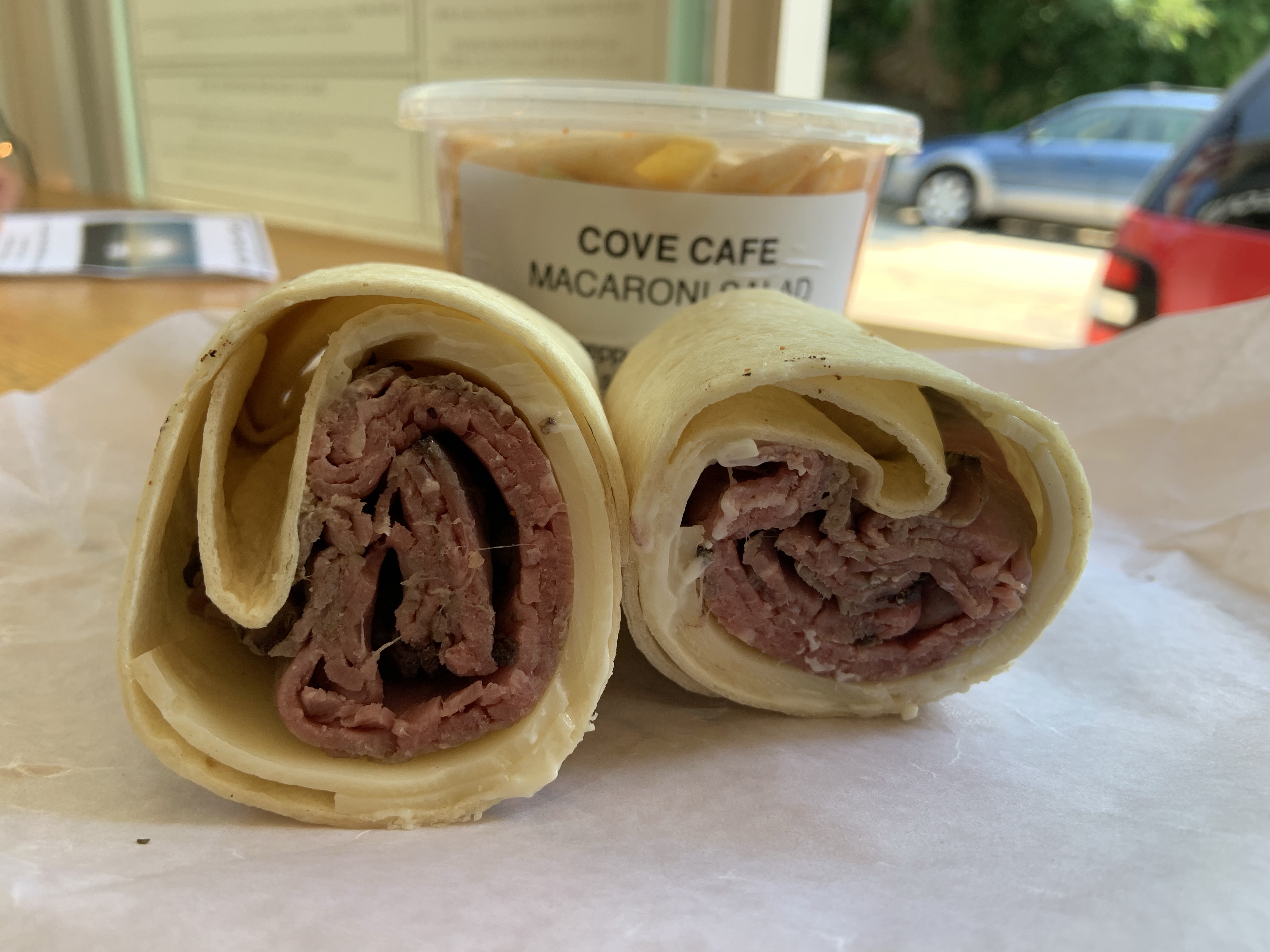 We have been meaning to get back to the Cove Cafe in Lanesville for a while now, so we stopped to pick up sandwiches recently. I quickly remembered why this place enchanted me! So many options are available with efficient friendly service. It was perfect for our light lunch of “make your own” wraps with roast beef (for me) and chicken salad (for Jim). We also picked up some salad to go-with. the roast beef was tender and perfect. Jim’s chicken salad was loaded with cranberries and other goodies which he enjoyed.