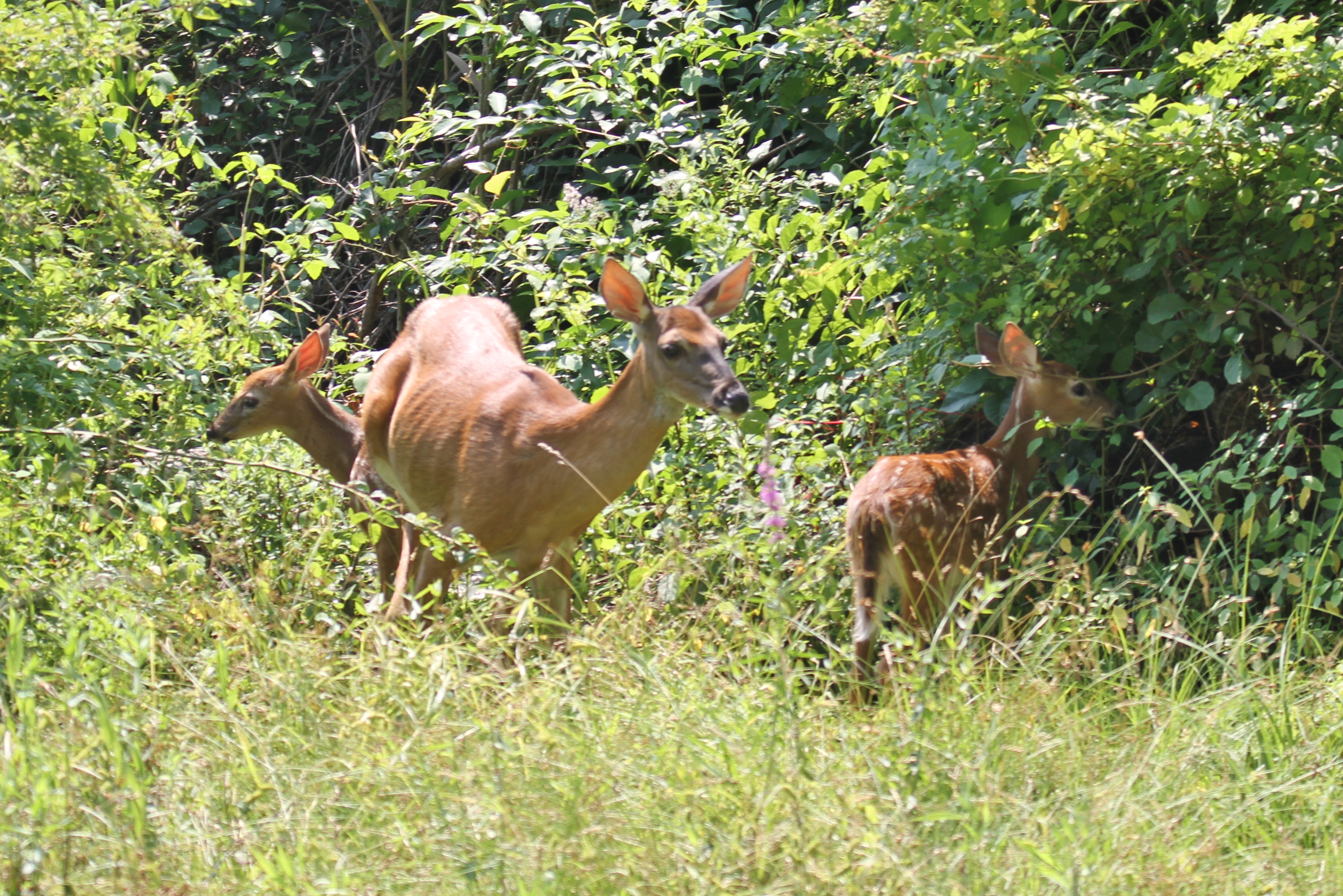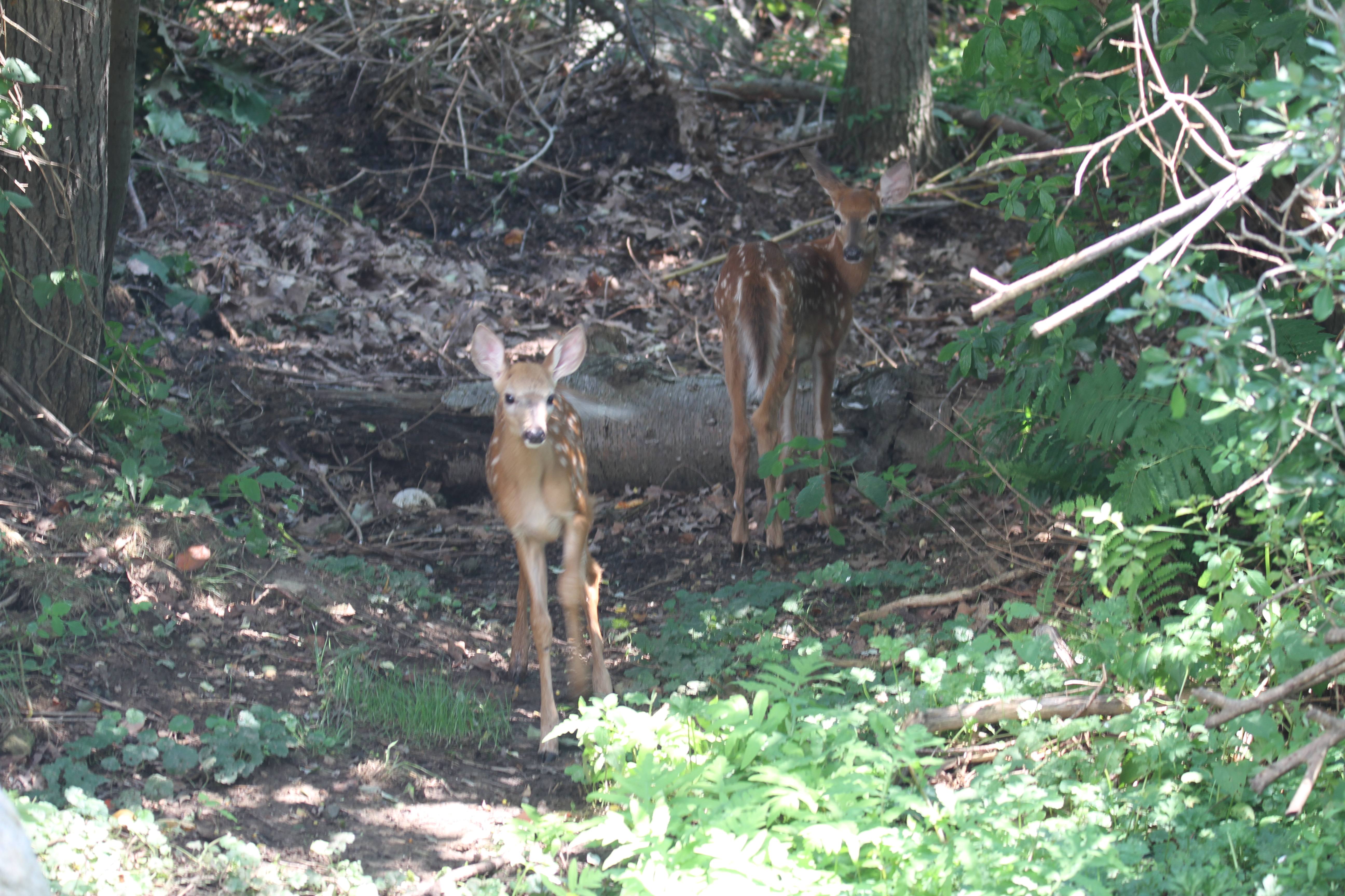 As an update to my previous post regarding an up close visit from a fawn and its mother recently, today we looked out the window and were greeted by the sight of TWO fawns!!!! They came up even closer to the house, eating voraciously as Mom looked on. A couple of bicyclists startled them into running toward the woods but otherwise they seemed most fearless (as youngsters tend to be). What fun to watch them frolick and explore the yard! More photos and additional details can be found at Pat D’s Photos and Adventures Facebook page.