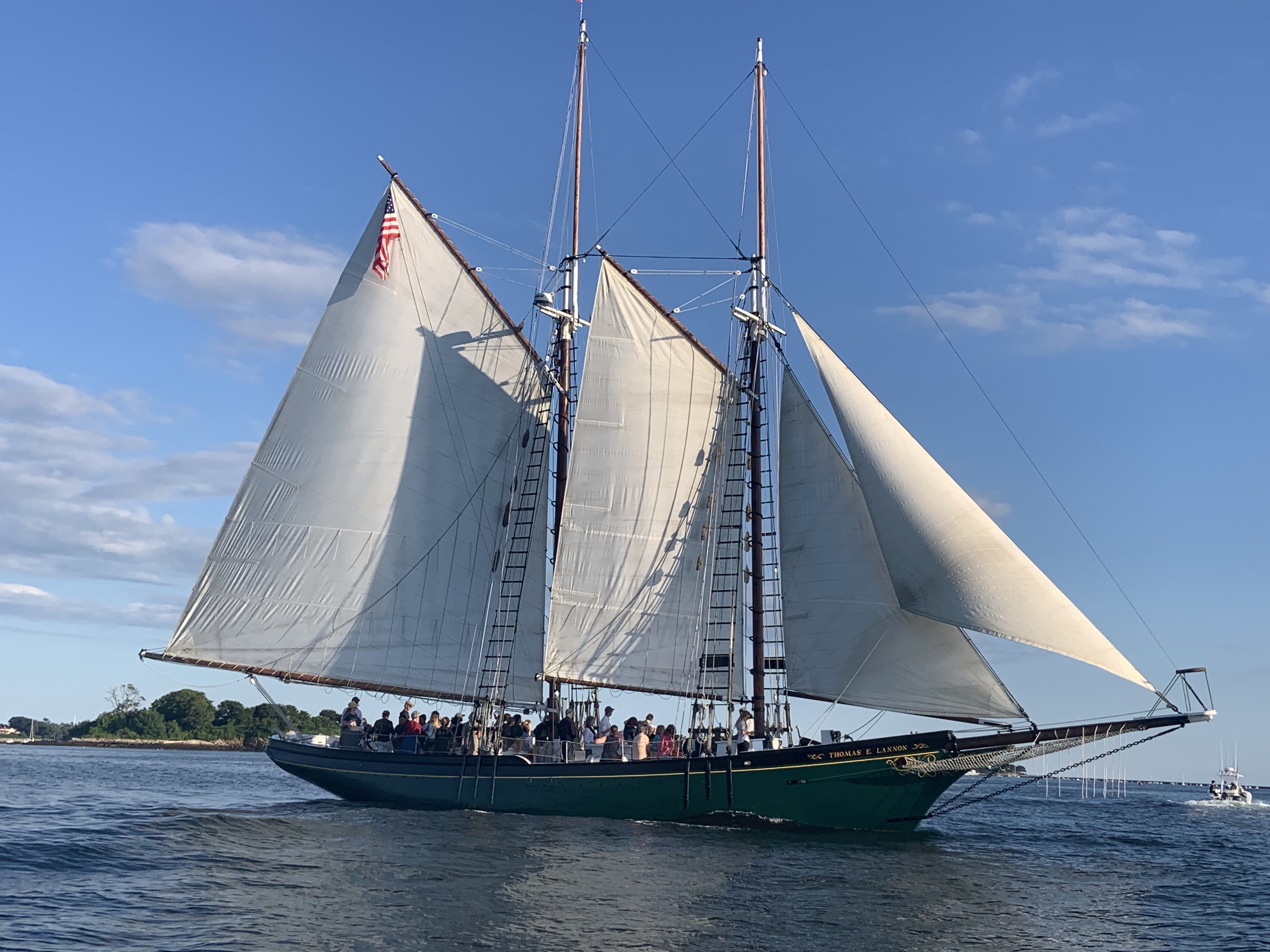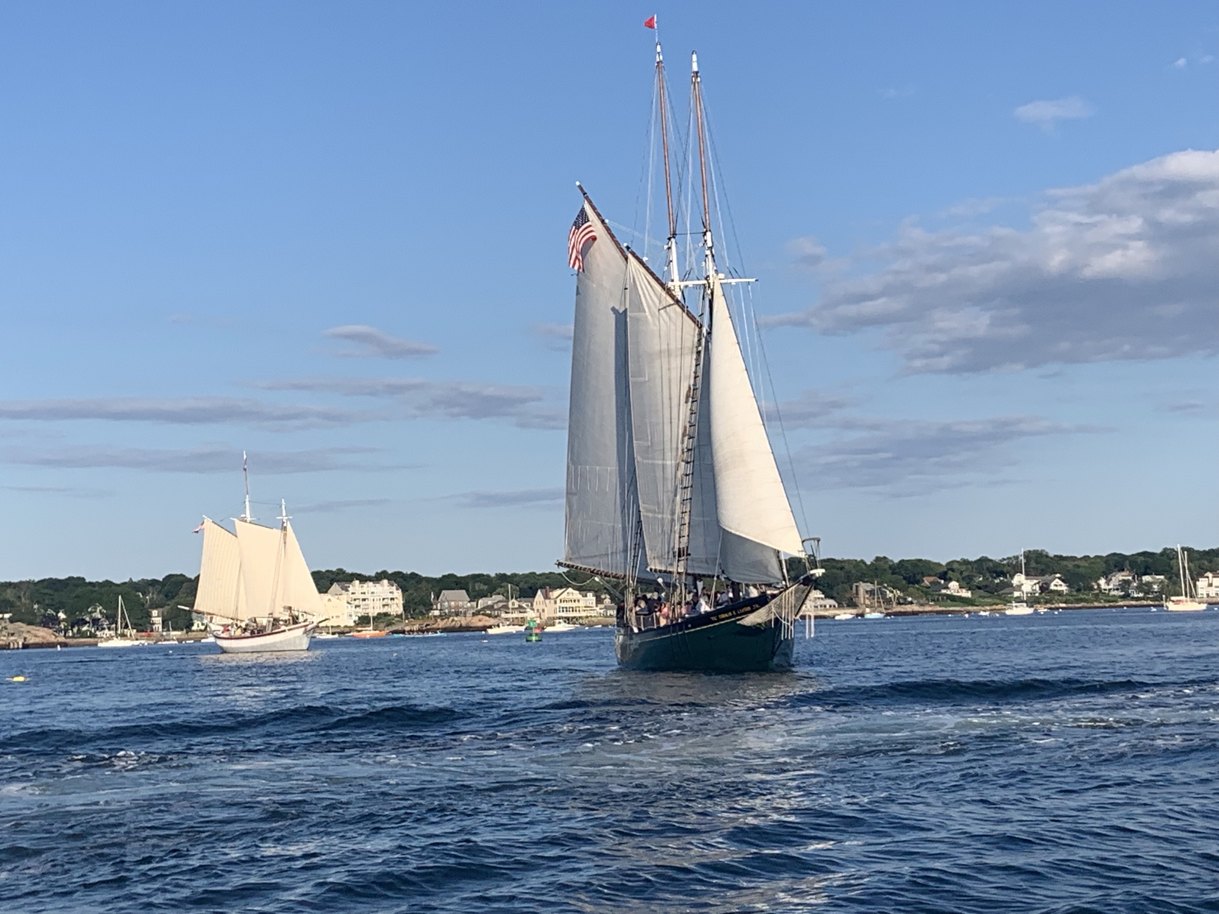 Thanks to Joey taking us for a ride near dusk aboard Tide Together, we were able to see some of our favorite sights from the water. It was a beautiful night, perfect for a ride. Anytime you get a chance to take a ride in the harbor is an opportunity to give your eyes and spirit a real treat. Have we mentioned lately how happy we are to be here? Happy Anniversary of our honeymoon in Gloucester 1985, GMG Jim!