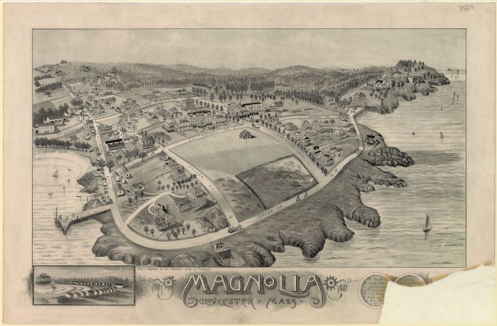 “This item was specifically selected for virtual display during the summer months because from the mid-1800s and into the 1900s Magnolia was a vacation destination for Bostonians and other New England and New York residents. This map was published in 1887, so it depicts Magnolia in its relatively early days of development. “