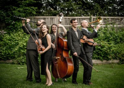 Ezekiel’s Wheels honed their craft in Boston’s farmer’s markets and subways stations, where the informal settings created ideal opportunities for musical experimentation. They succeeded in building up a community of fans and friends across the city. They have since fine-tuned their skills, and have performed at the Shalin Liu Performance Center, the Kennedy Center and at Yidstock. In 2017 they expanded their repertoire to include songs in Yiddish and English. Ezekiel’s Wheels features Jonathan Cannon (violin), Kirsten Lamb (double bass, lead vocals), Nat Seelen (clarinet), Pete Fanelli (trombone), and Abbie Reisman (violin, backing vocals), who sadly is not available to play at this concert.