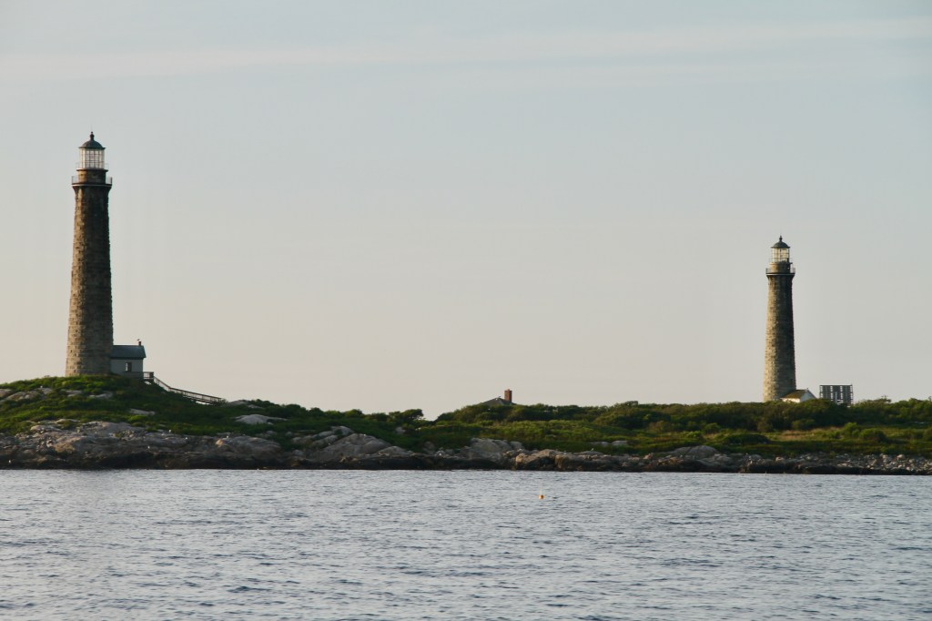 While going by Thacher Island the other day I took some quick photos that demonstrate how its twin lighthouses line up to show due north and due south. You can see that, when heading exactly north or south, the lighthouses line up so that one is no longer visible.