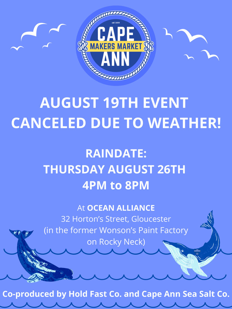 We are trying it again! The postponed Cape Ann Makers Market WILL BE HELD tonight Thursday Aug 26 at the Paint Factory and Ocean Alliance from 4-8 PM. I will have notecards, prints and other gifts available and if you mention GMG, there is a discount on whale items (excepting notecards)! Contributor Donna Ardizzoni will also be there along with Cape Ann Sea Salt and Hold Fast. Looking forward to meeting you tonight to benefit Ocean Alliance. It’s the final Culture Splash event for Summer 2021 so don’t miss out.