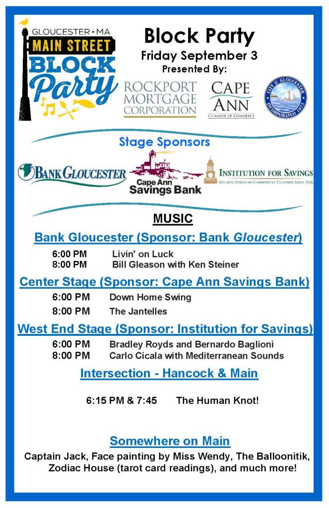 Cape Ann Chamber of Commerce and local businesses roll out the red carpet on Main Street for Gloucester Schooner Festival with a street party! Shopping, food, entertainment, and fun are on the agenda all evening.More Info