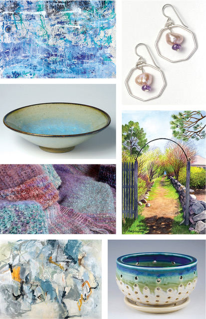 Pam Stratton shares, “One of the fun things I did over the summer was to take a 3 day class in Truro at Castle Hill Center for Arts with Dietlind Vander Schaaf on creating layers and translucency with encaustic wax. At home I have a family of crows that I feed so one of them found their way into my encaustic work. My intention is to weave mosaic and encaustic Art together.” Rob Diebboll has a collection of new oil paintings from the spring and summer with themes of meditation and joy at the beach. The out-of-the-way beaches of Cape Ann continue to inspire Rob’s portrayals of figures, and dogs, in nature. Cynthia Curtis is overjoyed at the turnout for the Spring and Summer tours and her classes, “It was clear to me that playing with clay has never been more therapeutic for all of us. I am so grateful for the community of wonderful students and teachers who make beautiful pots here.” She is also inspired by the interest in her Sea Fossil pieces. Up close, one can see the very fine detail. Step back and the pieces look like an ancient map. Cynthia quips that it started as a happy accident, “I certainly did not wake up one morning and think ‘I’ll start a new line of Sea Fossil pieces. That’s how it goes with pottery. Expect the unexpected.” Finally, Jacqueline Ganim-DeFalco reports that thanks to the advent of “Covid Hair” hair accessories have taken center stage in her collection. “I began designing exclusively to re-introduce hair jewelry 17 years ago, and this year, most unexpectedly women have re-discovered the joy of long hair!”
