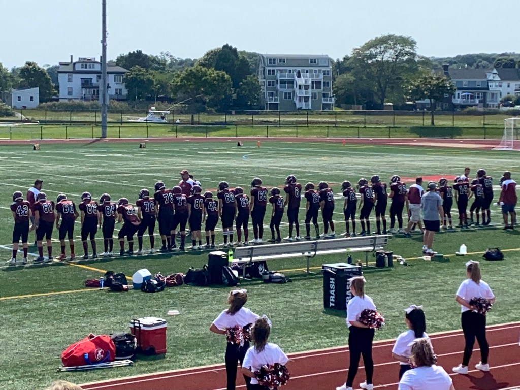 Football on the river bank! I have hockey players….who also play some baseball and lacrosse….and now Finn plays Fishermen Youth Football. He had his first game this Sunday on the New Balance Field at Gloucester High’s Newell Stadium. First of all, the crowd who came to watch the Youth Football games was pretty amazing, but secondly, watching football on a beautiful Sunday afternoon as boat traffic coasts by to/from the cut bridge was pretty sweet. Only in Gloucester.